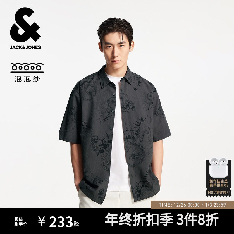 杰克琼斯男装衬衫秋季新款时尚中性简约纯棉舒适泡泡纱宽松短袖