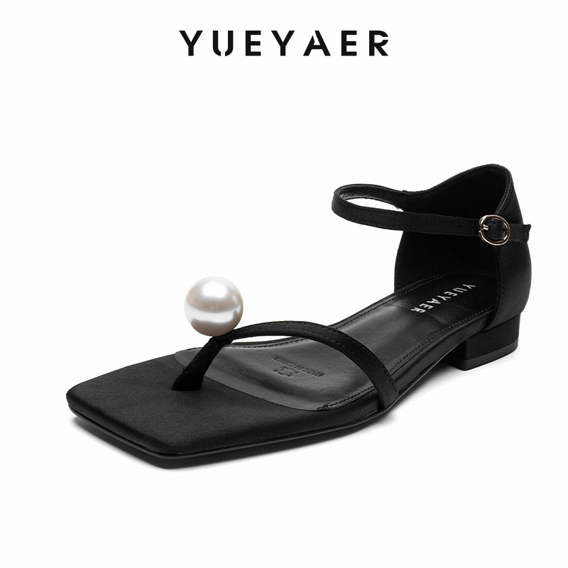 月芽儿法式女鞋夏季新款高级感珍珠黑色平底鞋夹趾时装凉鞋女