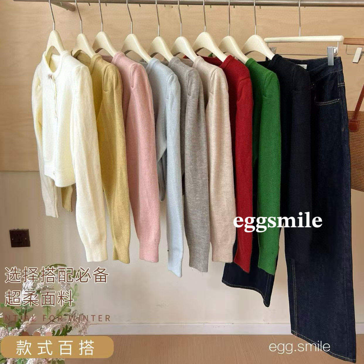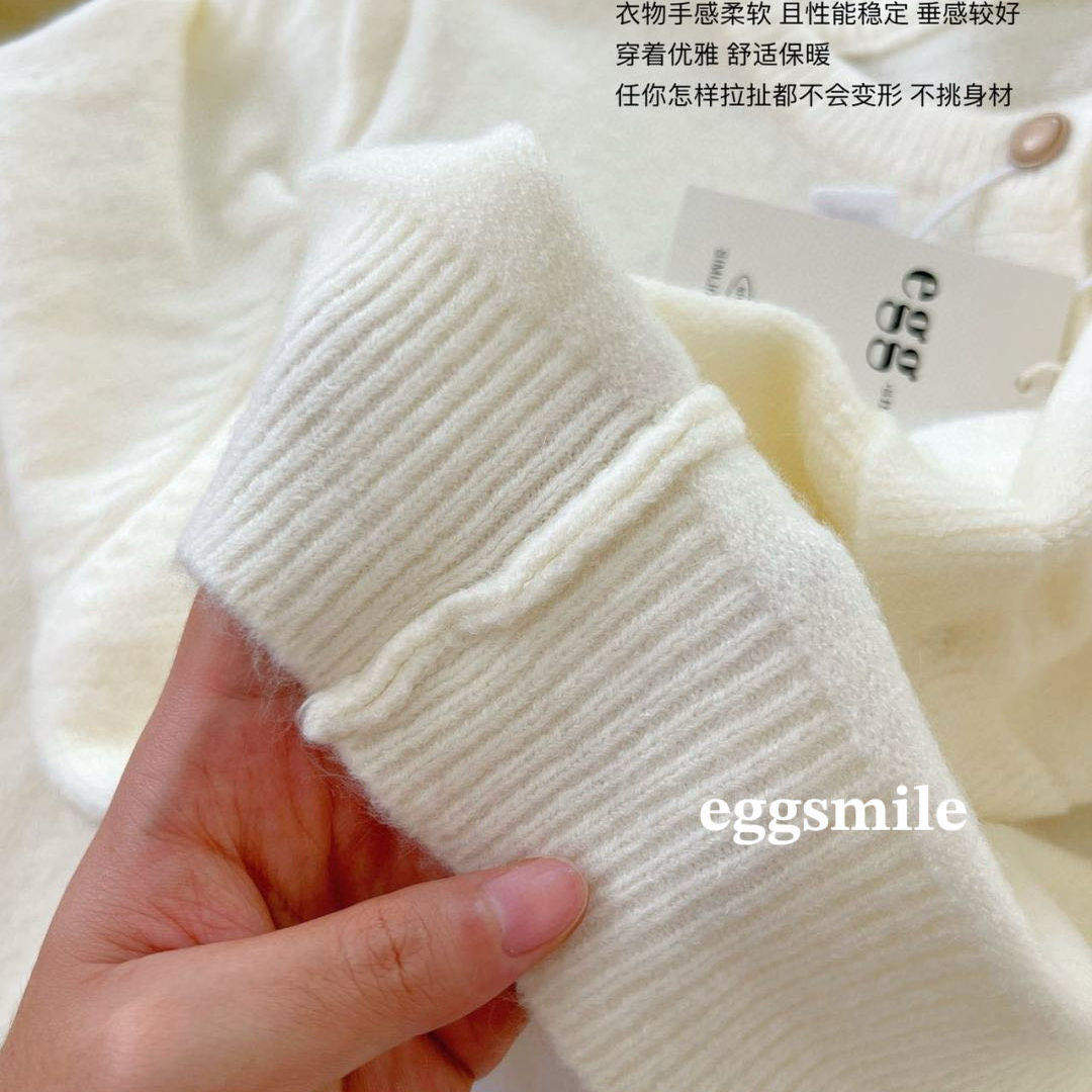egg smile法式复古赫本风正肩小金扣圆领针织开衫泡泡袖毛衣 ZD