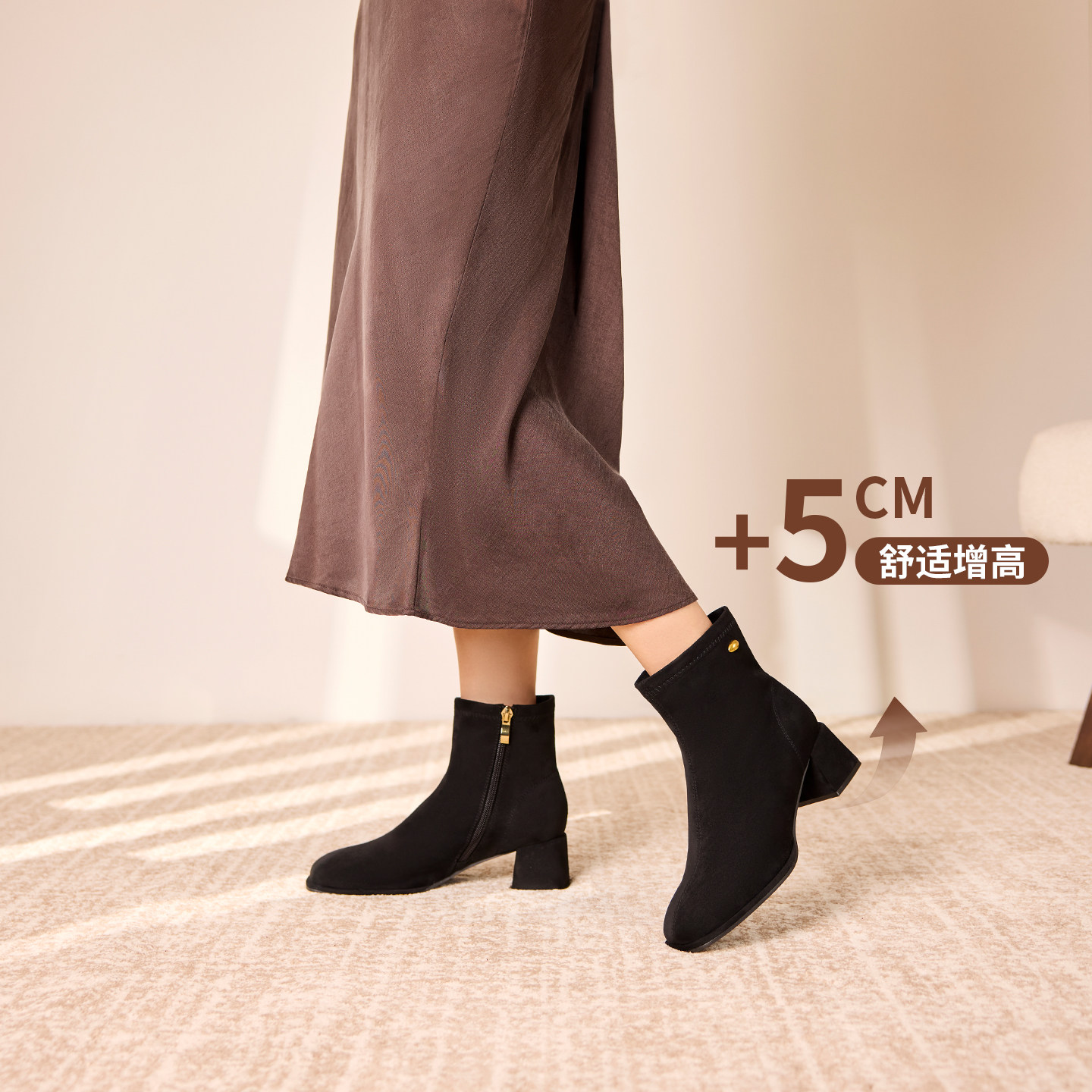 黑色复古高跟后拉链短靴女2025新款粗跟百搭小个子增高绒面瘦瘦靴