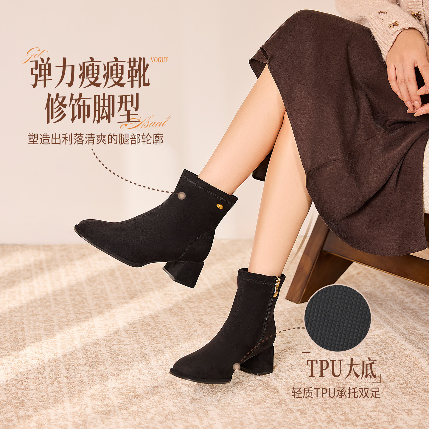 奥康 女鞋2025冬季弹力靴瘦瘦靴简约高级感粗跟增高中通百搭短靴