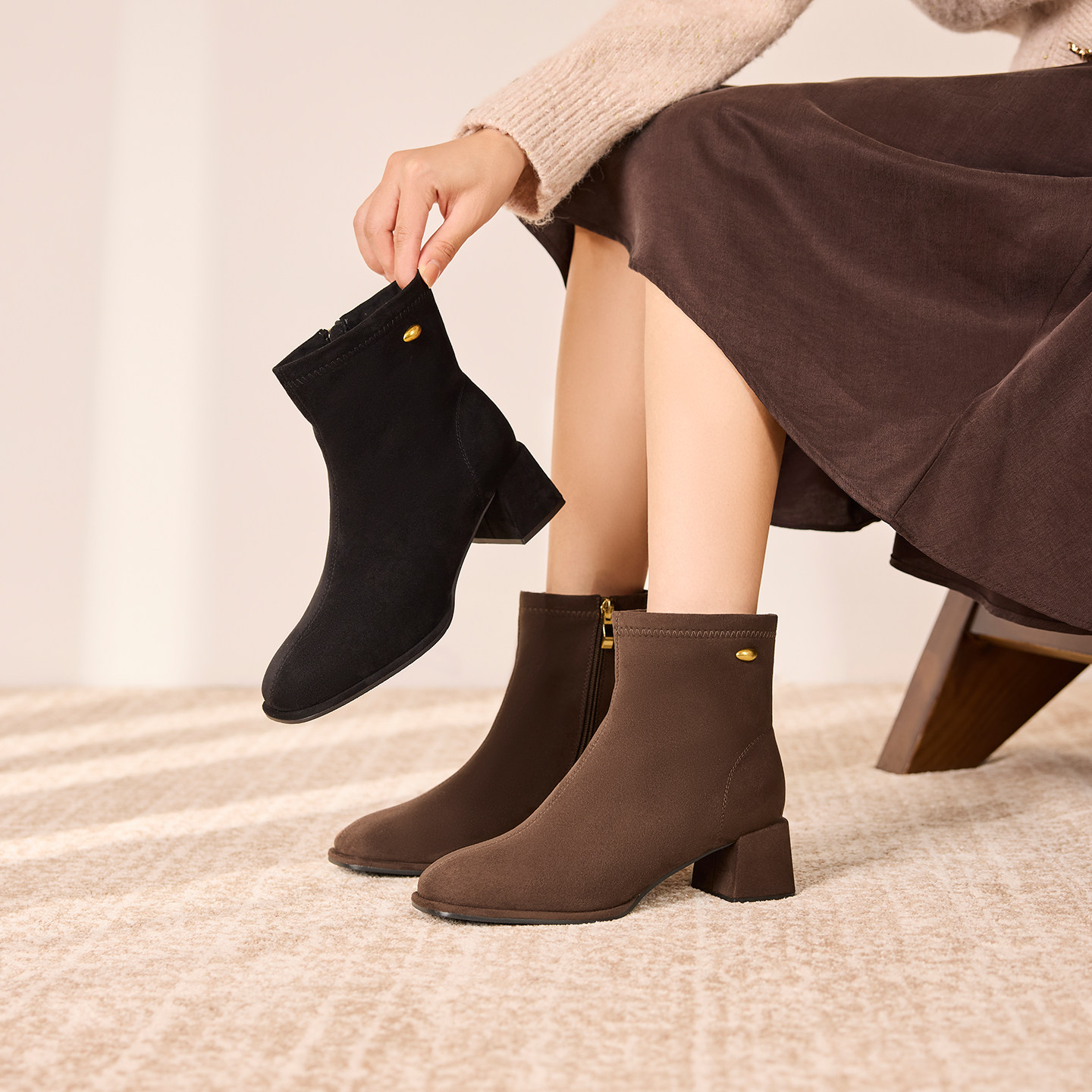 St&Sat/星期六高跟鞋女鞋秋冬款靴子冬季短靴25新款加绒粗跟靴子