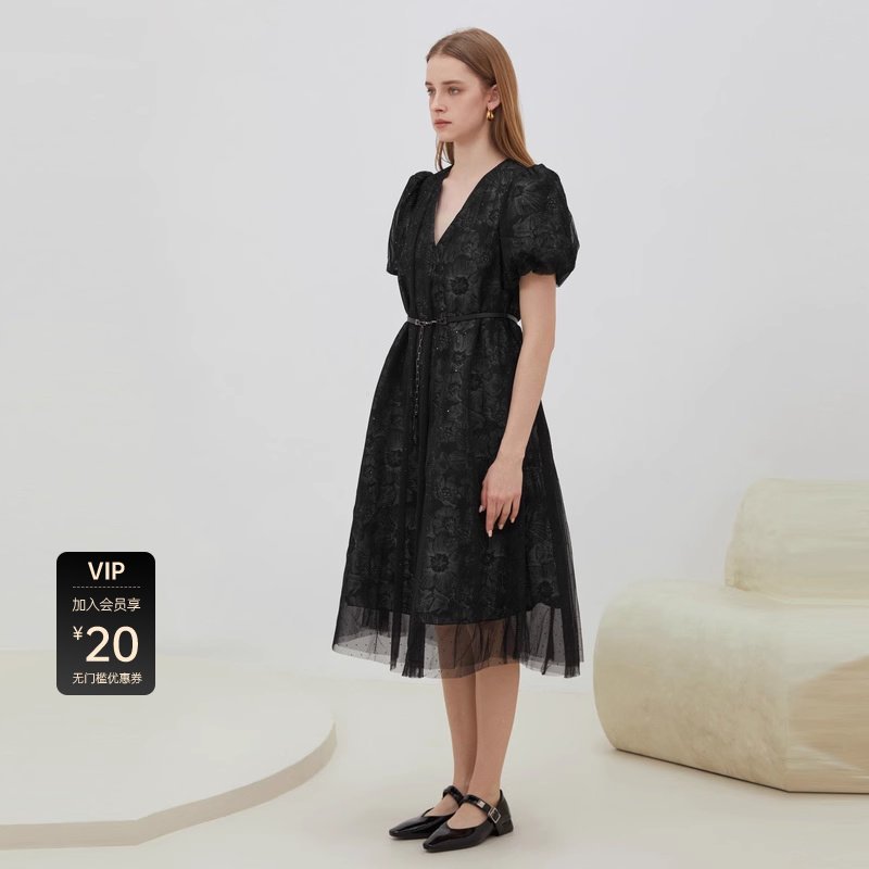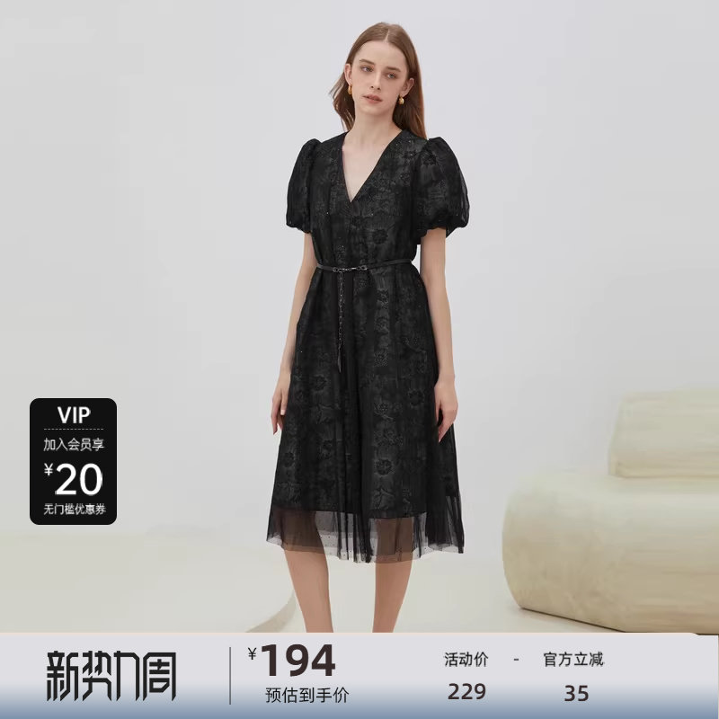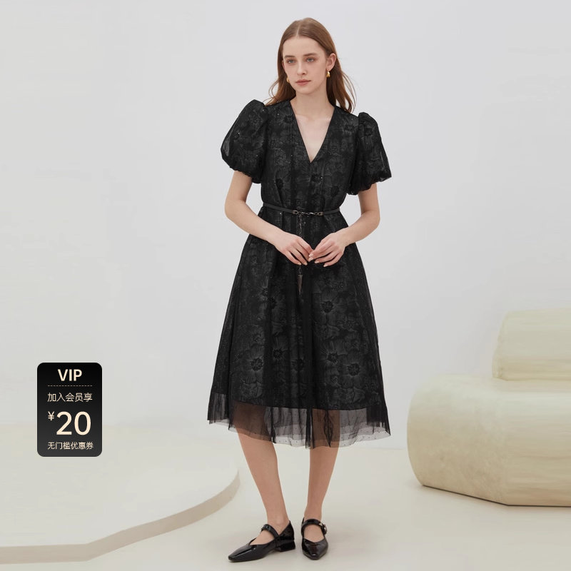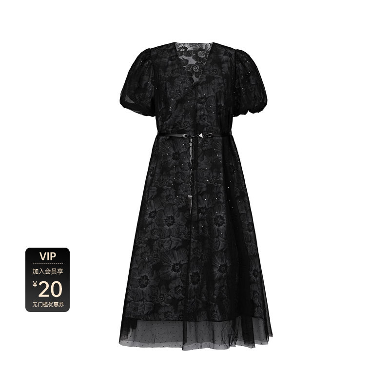 【sdeer奥莱】圣迪奥V领收腰印花网纱泡泡袖连衣裙S222Z122F