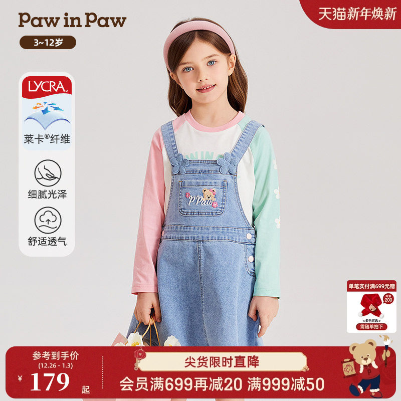 PawinPaw卡通小熊童装春夏女童印花软牛仔背带舒适连衣裙