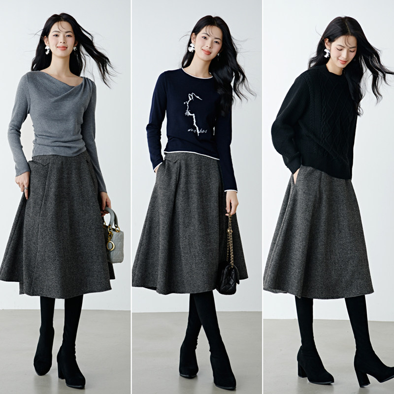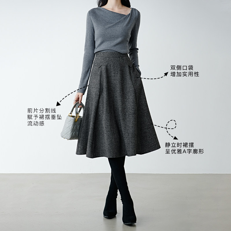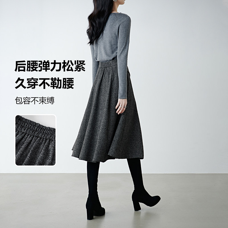 晚白年秋冬新款经典简约羊毛裙格雷灰高腰显瘦百搭半身裙