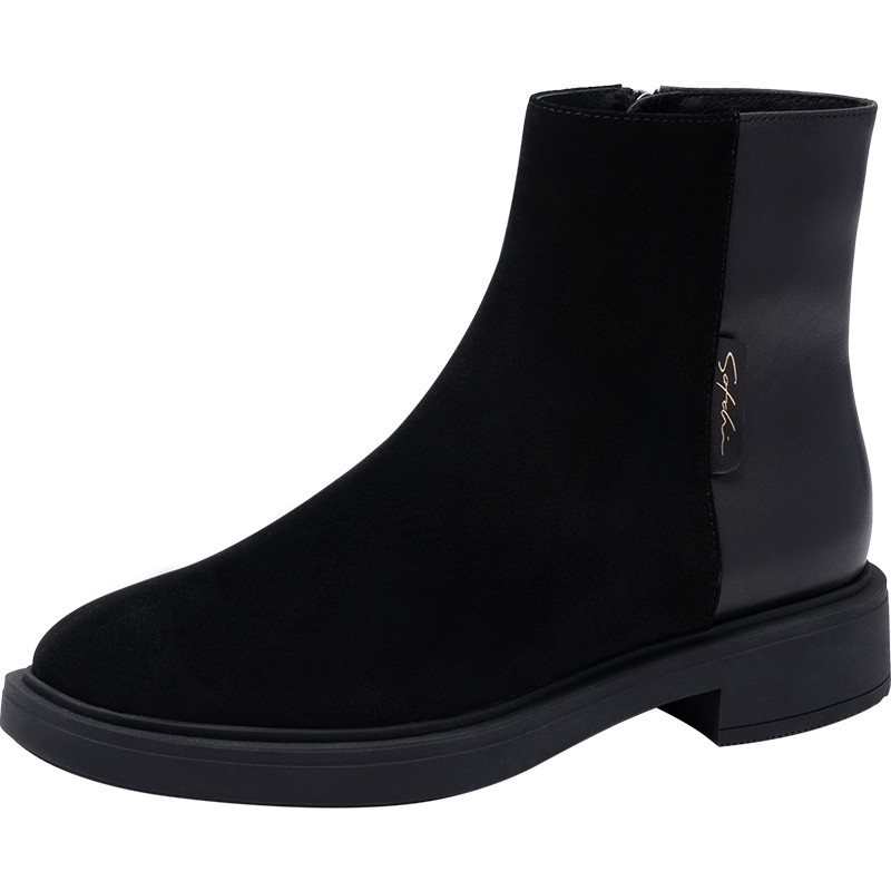 沙驰女靴时尚拼接侧拉链短靴2025秋冬季新款低粗跟时装靴瘦瘦靴子