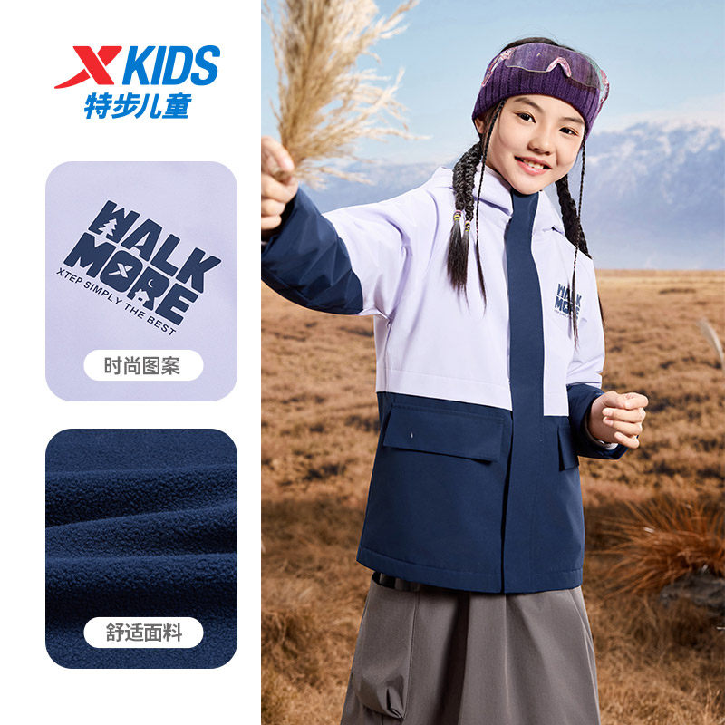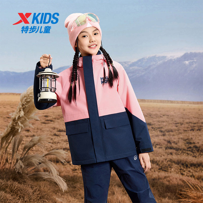 特步童装秋冬新款儿童运动外套女童小中大童拼色时尚连帽保暖风衣