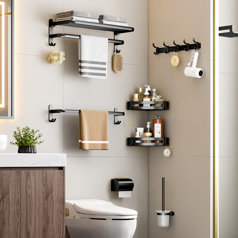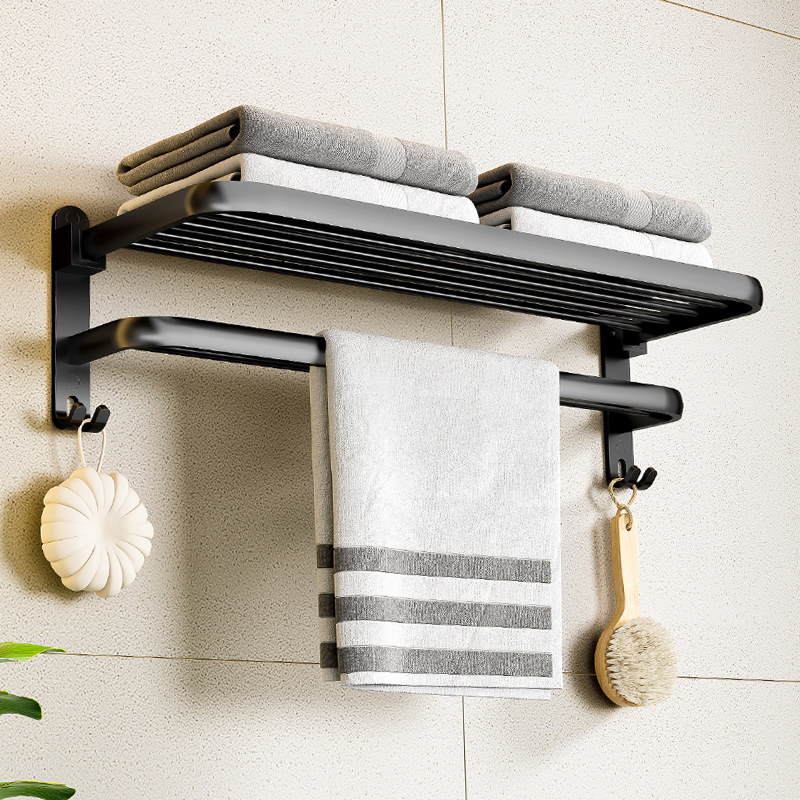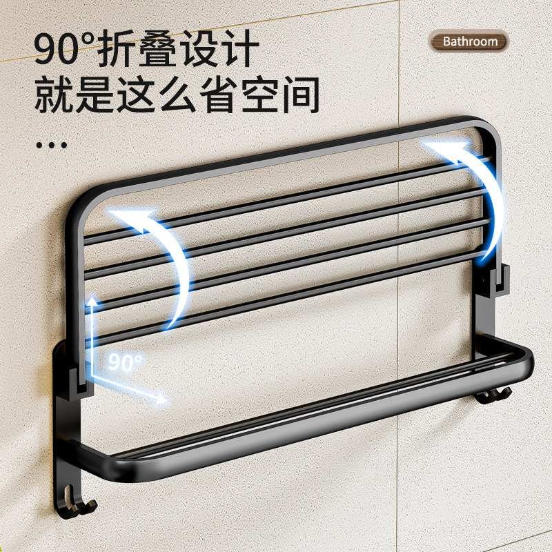 浴室毛巾架黑色免打孔卫生间挂浴巾架折叠卫浴厕所置物架子洗手间