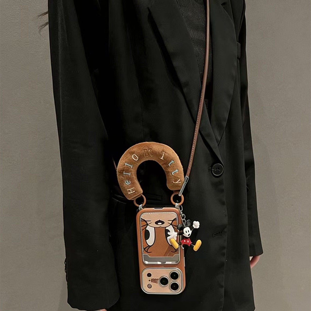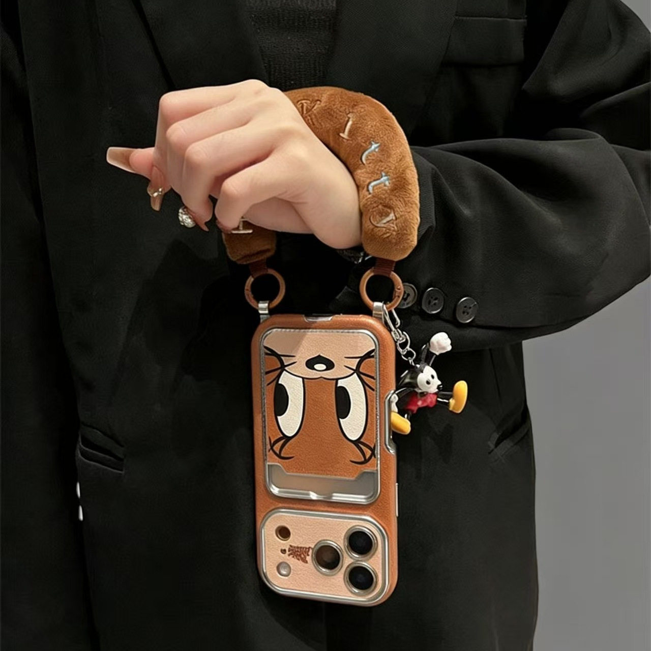大视窗棕色杰瑞鼠表情适用苹果17promax手机壳iPhone16pro毛绒手腕带15plus可爱13卡通14pro新款斜跨挂绳女款