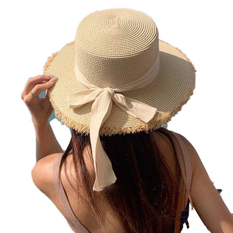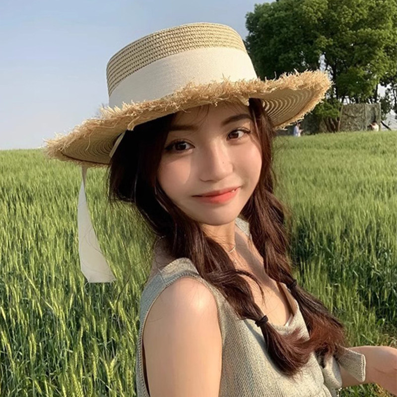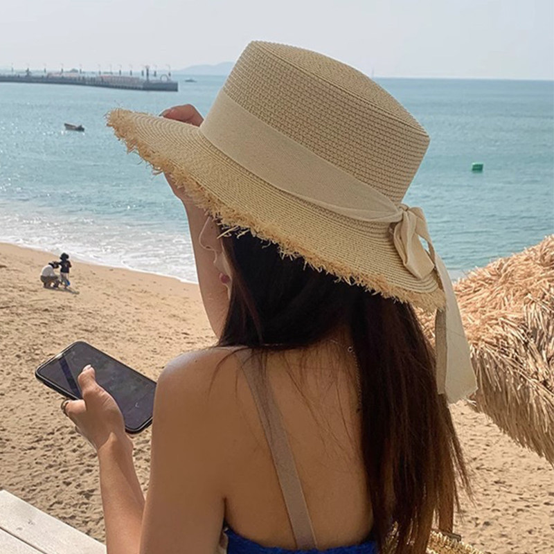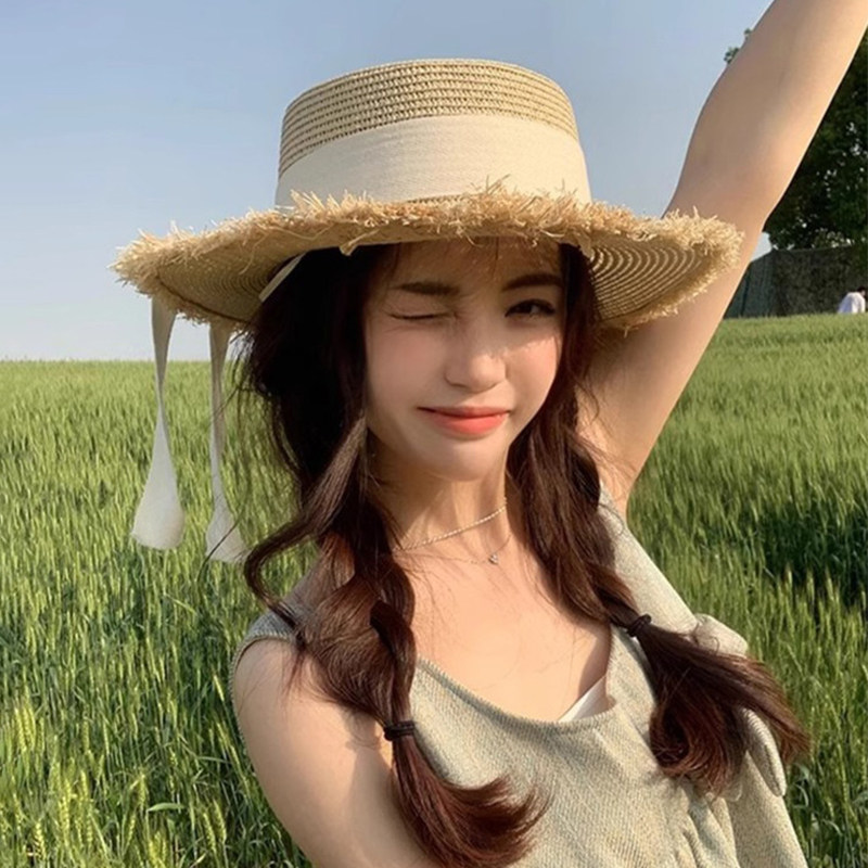 日系草帽飘带蝴蝶结太阳帽子女海边度假沙滩帽平顶礼帽旅行可折叠