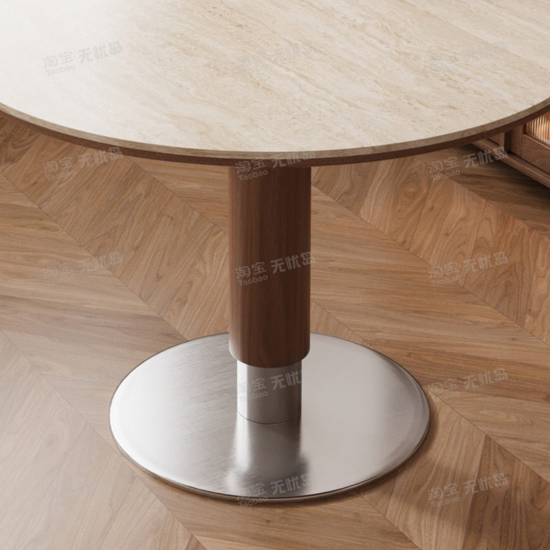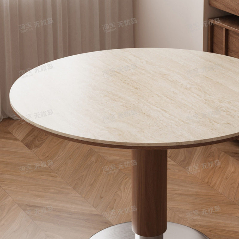 中古风洞石岩板圆桌复古圆形餐桌家用小户型北欧包豪斯实木吃饭桌