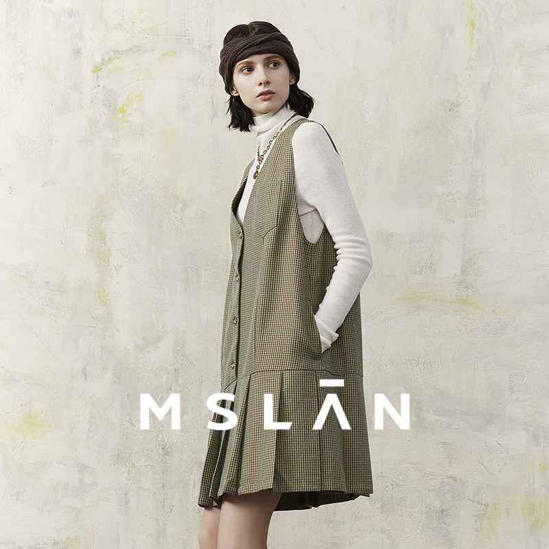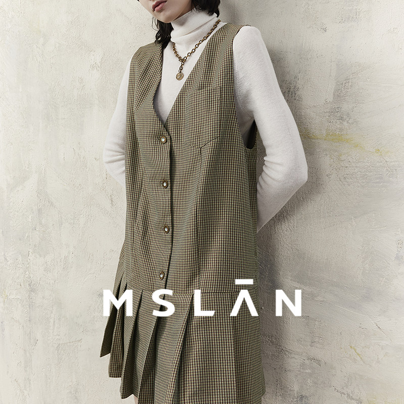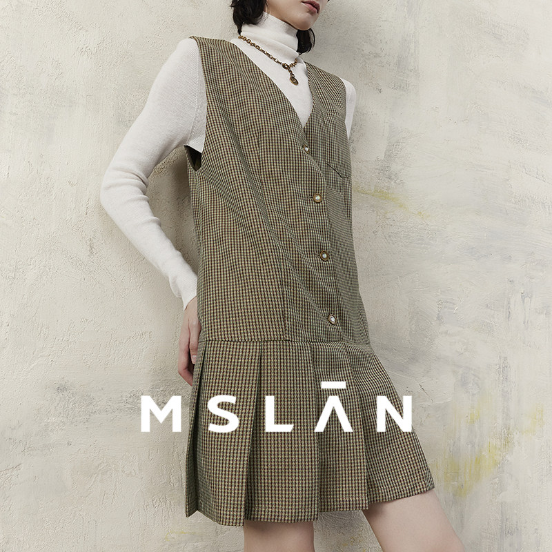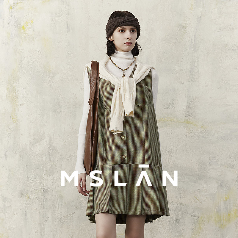 MSLAN英伦学院压褶连衣裙 艺术生气质背心裙宽松格纹V领短裙女