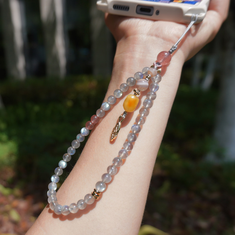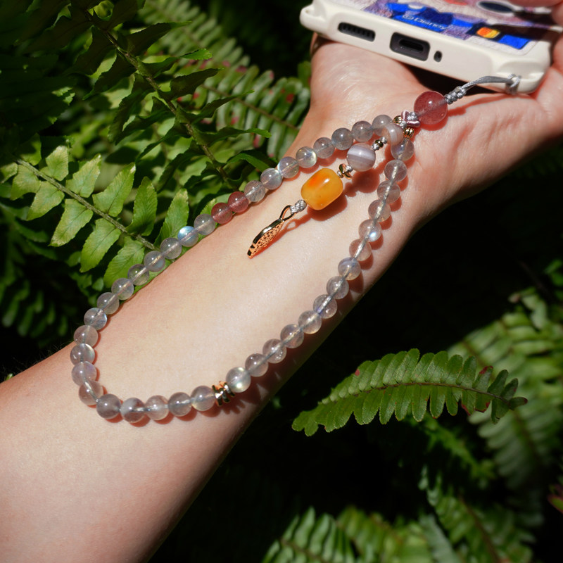 天然灰月光手机链蜜蜡玛瑙挂饰女手腕水晶挂件防丢防摔草莓晶挂绳