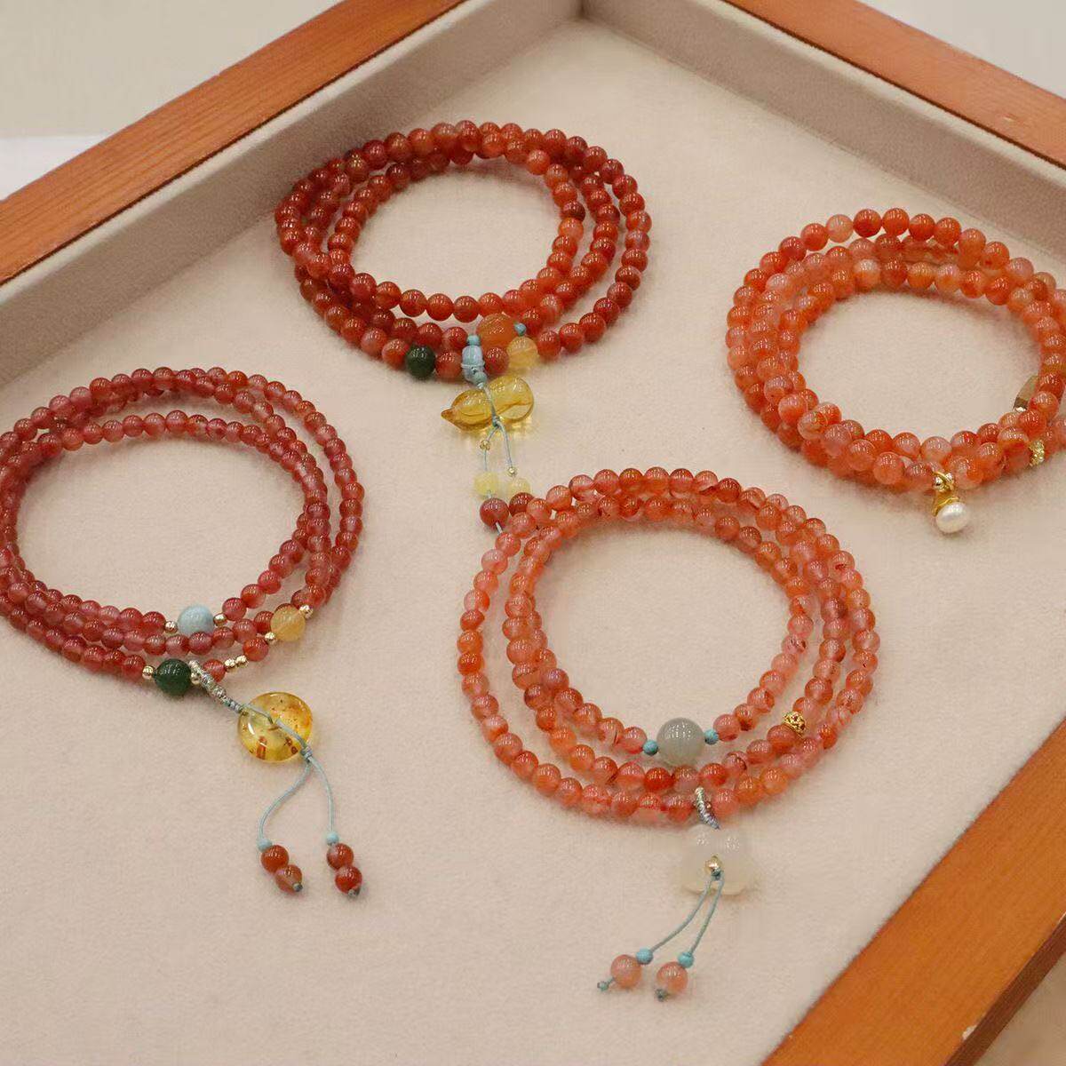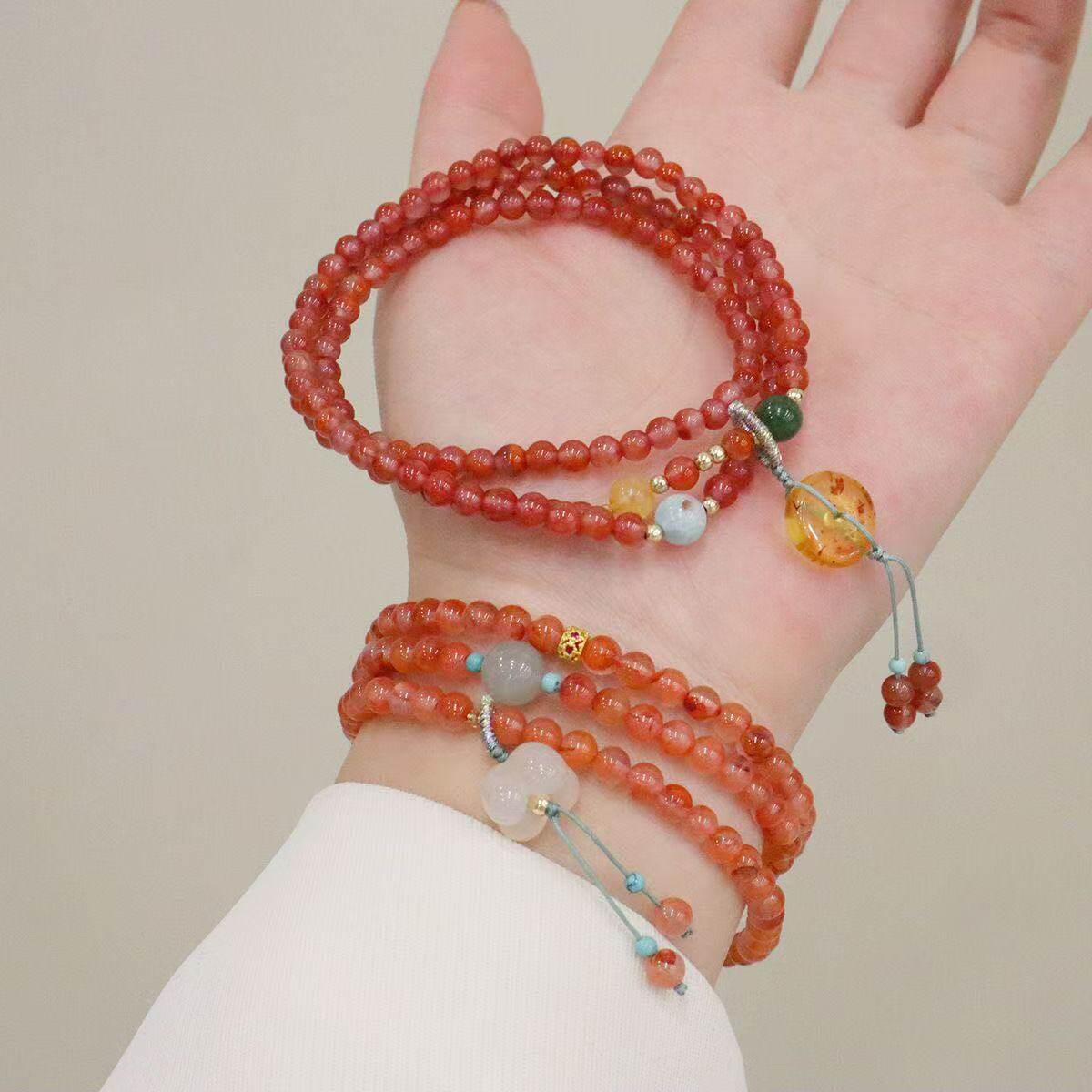 甜美多层琥珀蜜蜡平安扣铃兰花手串轻奢小众设计冰飘南红三圈手链