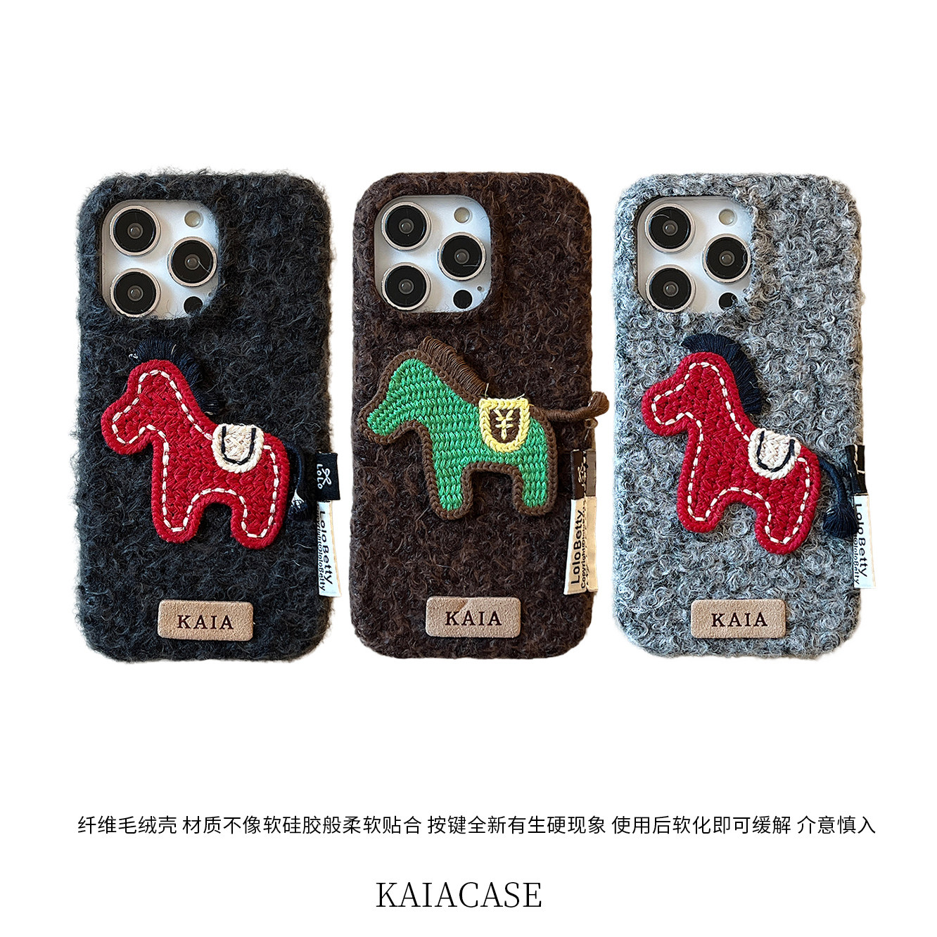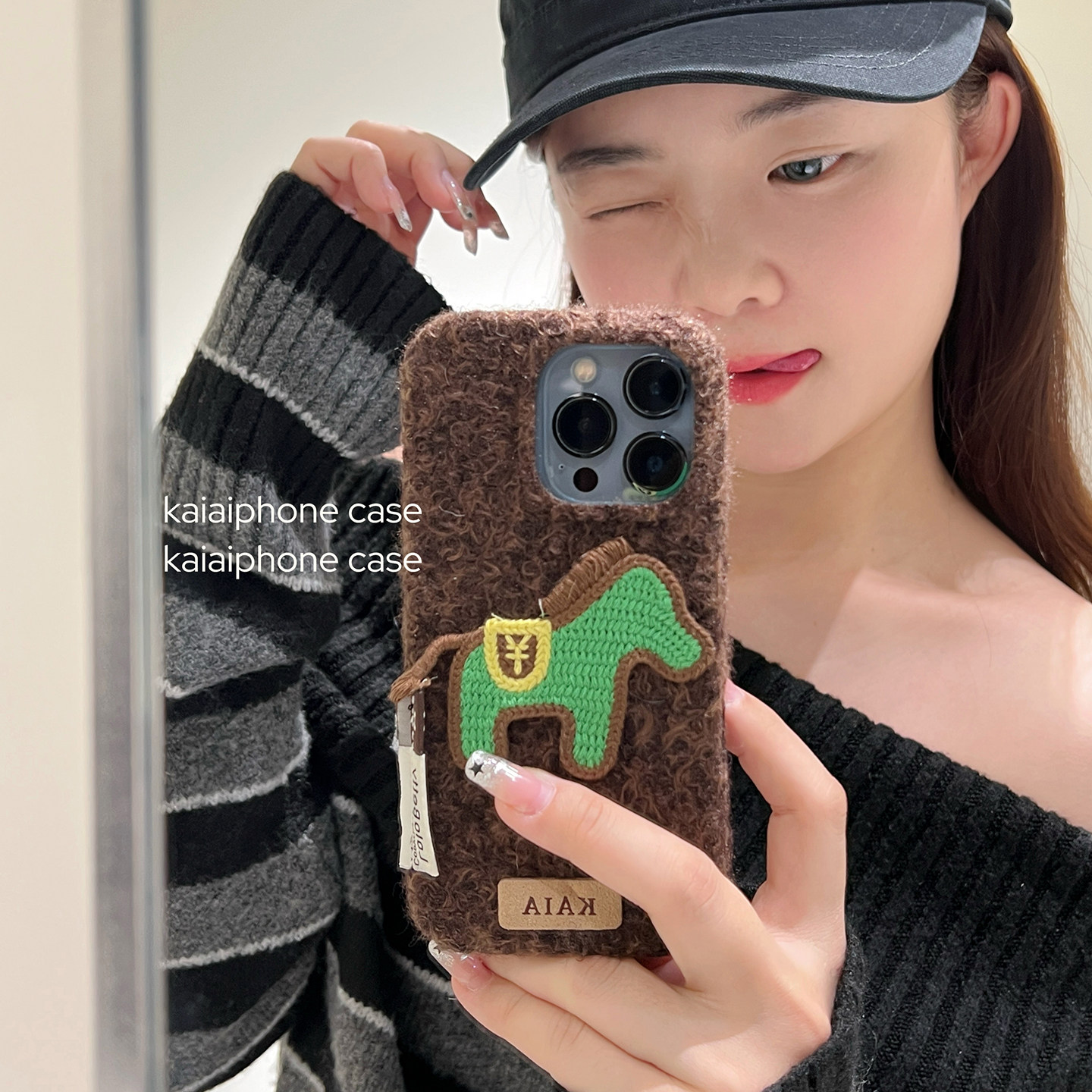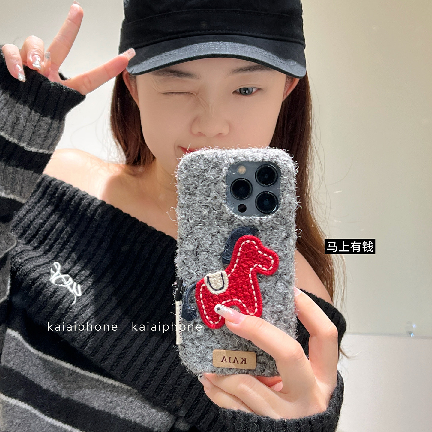 kaia 秋冬毛绒茸刺绣马上有钱标签适用苹果17promax手机壳iphone16pro新款15女14pro创意13pro全包布料手机套
