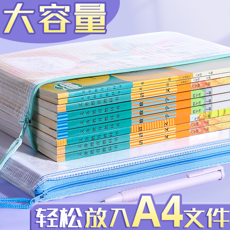 A4网格文件袋科目分类袋书袋透明文件收纳袋小学生初中生学科分类袋拉链式档案塑料办公学生专用袋试卷收纳袋