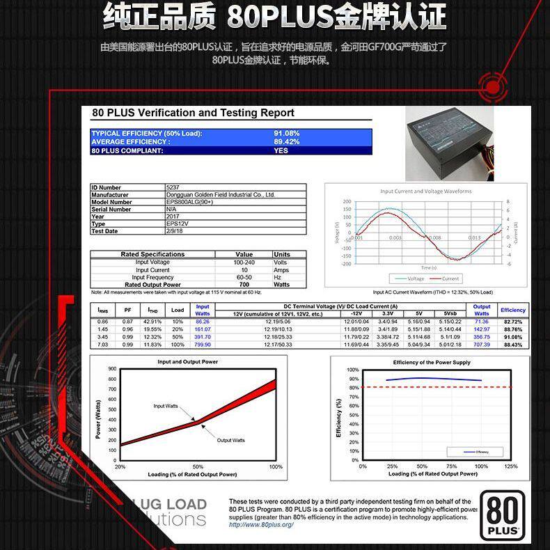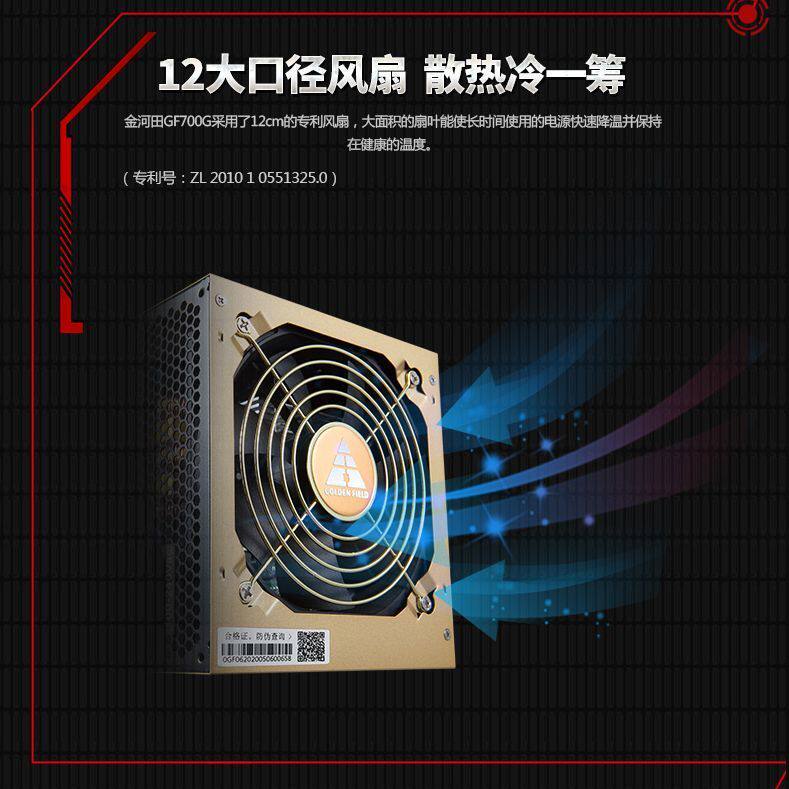 金河田监制GF800G额定800W金牌直出日系电容台式机稳压静音电源