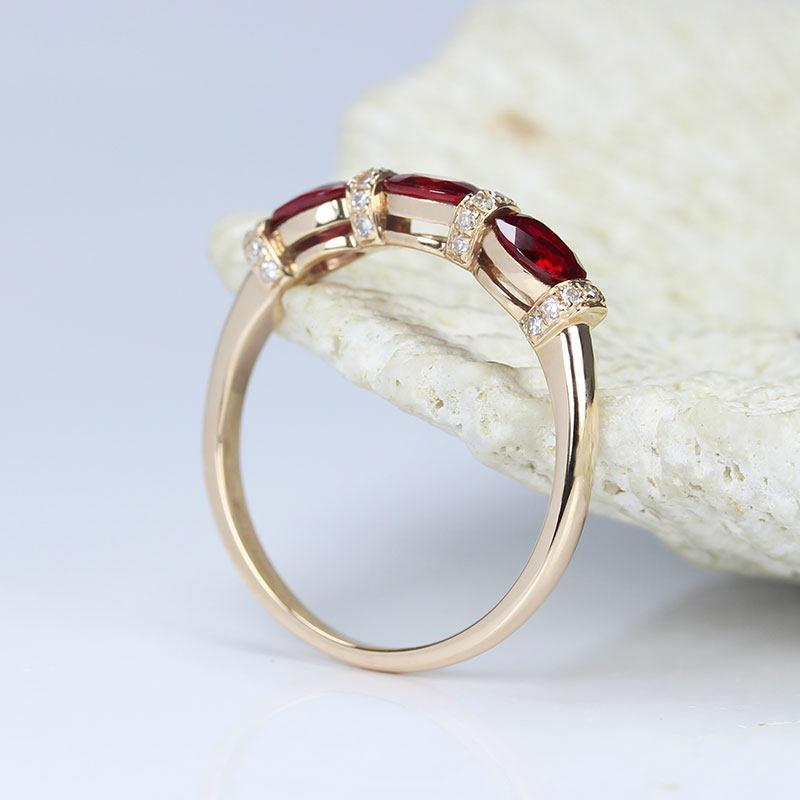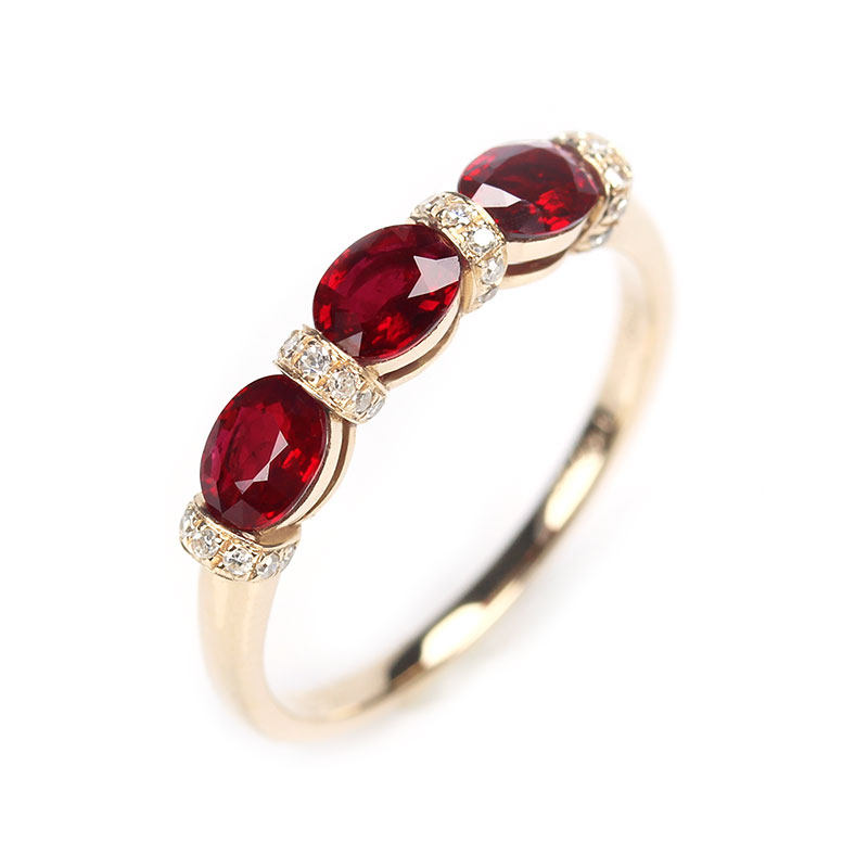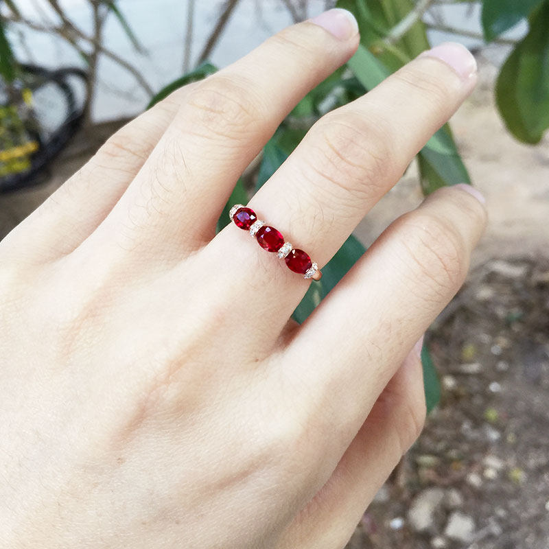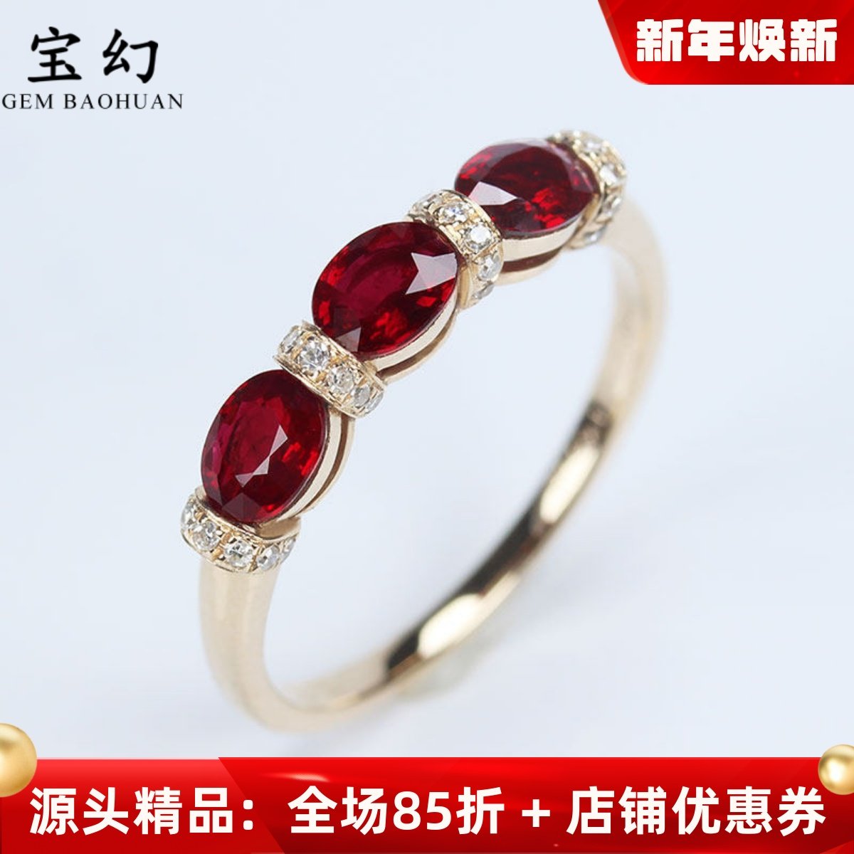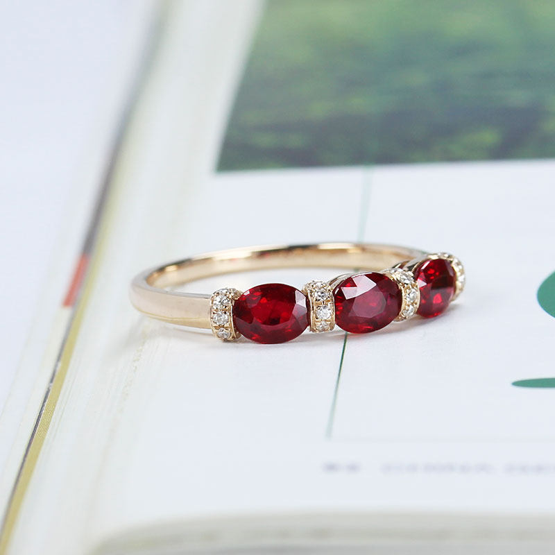 18k玫瑰金天然鸽血红宝石戒指 钻石群镶椭圆深红色尾戒排戒女款
