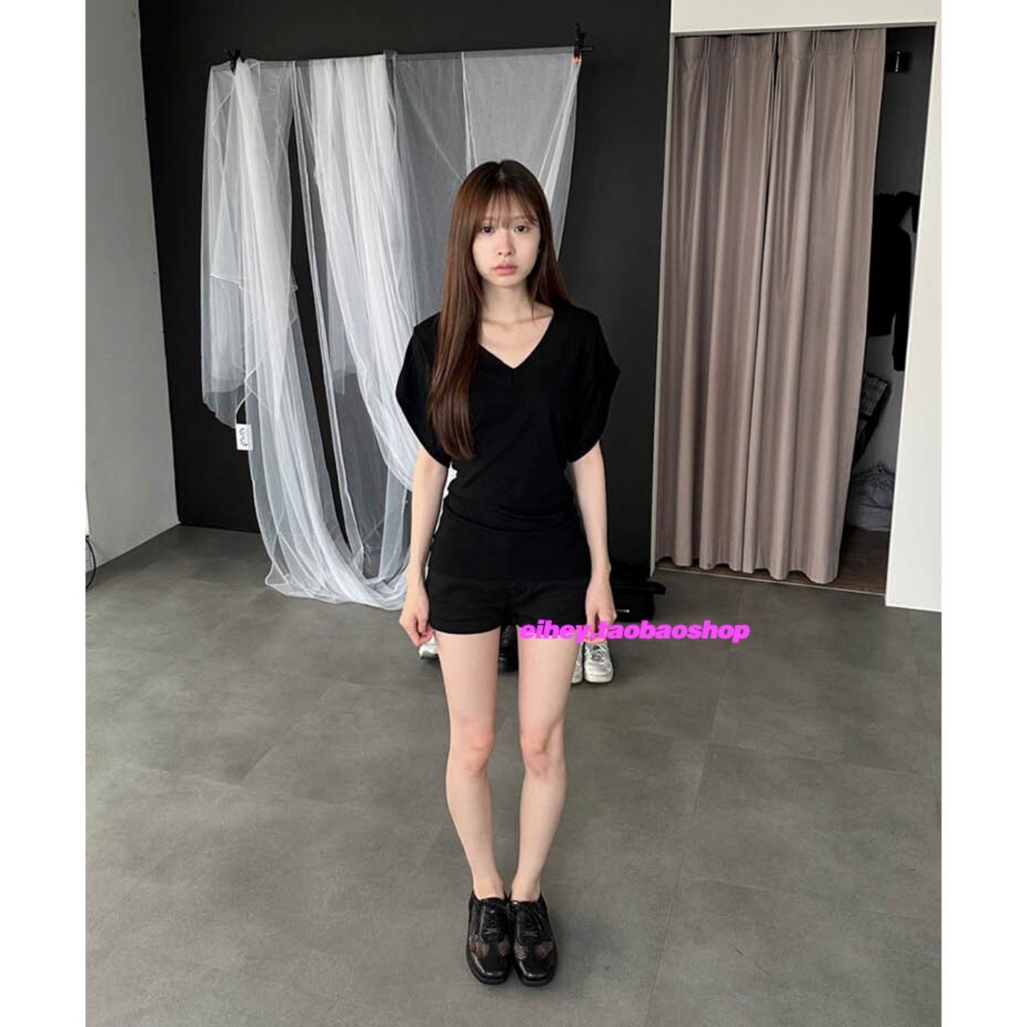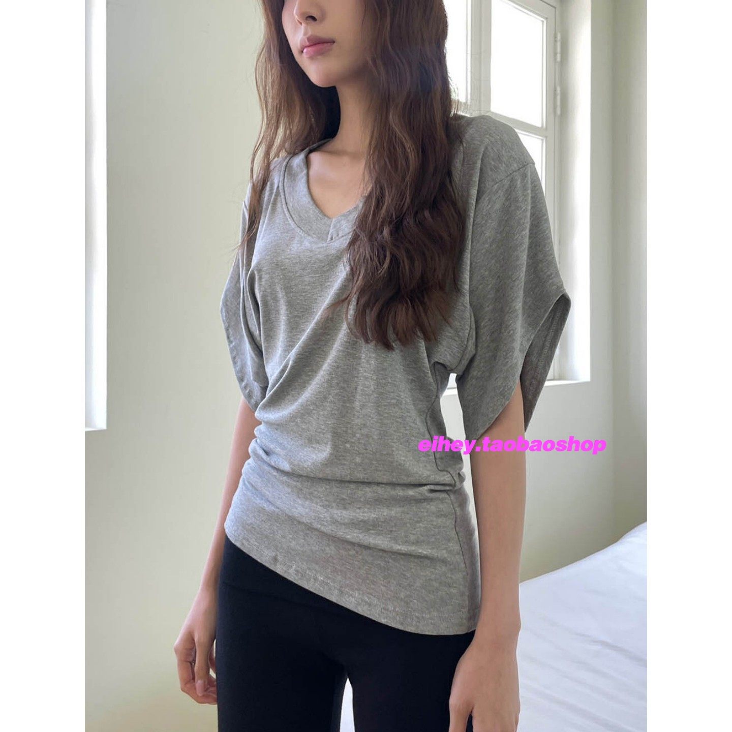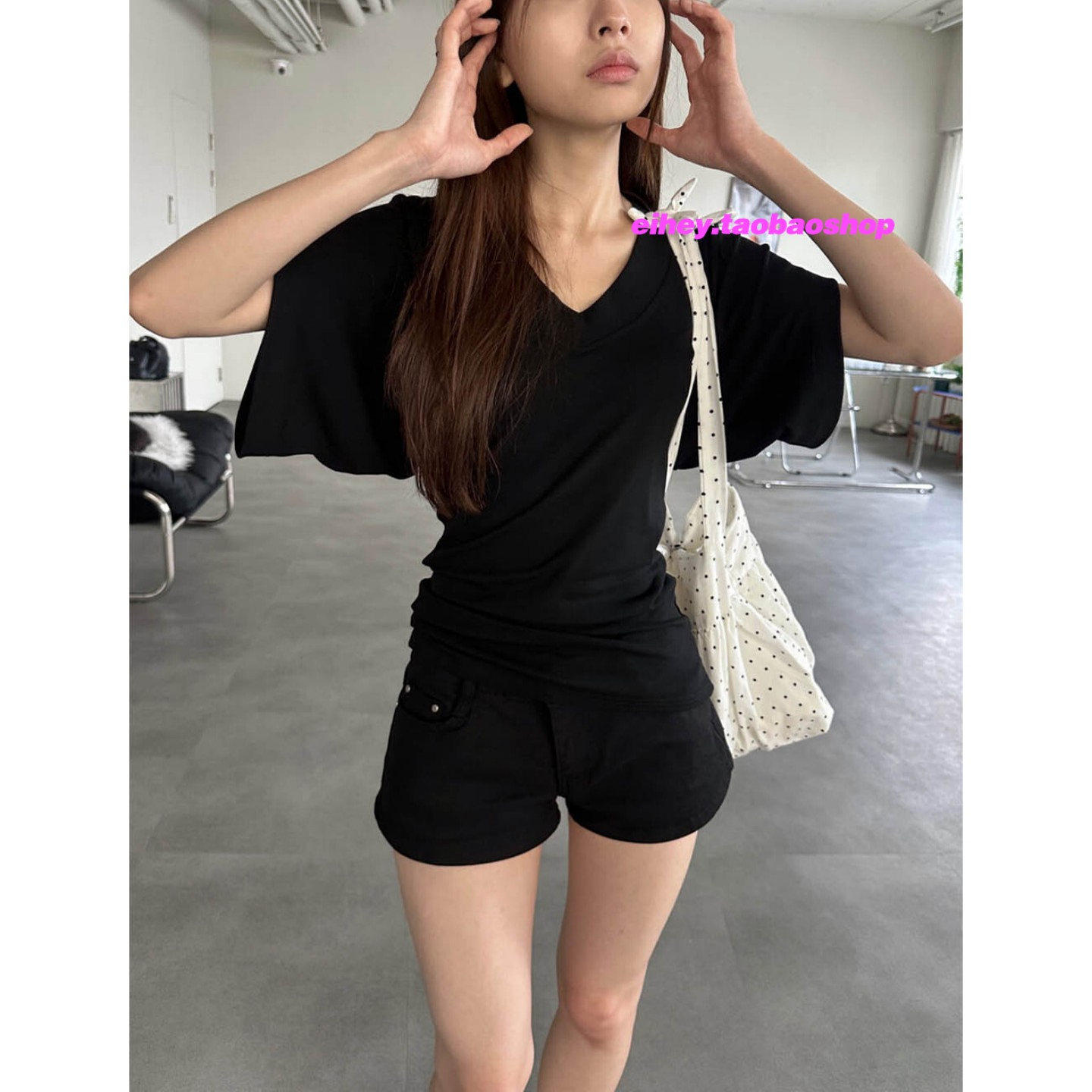 eihey诶嘿慵懒风宽松V领短袖夏季小众百搭修身显瘦简约t恤上衣