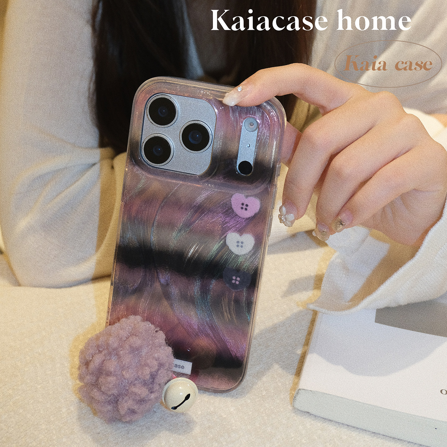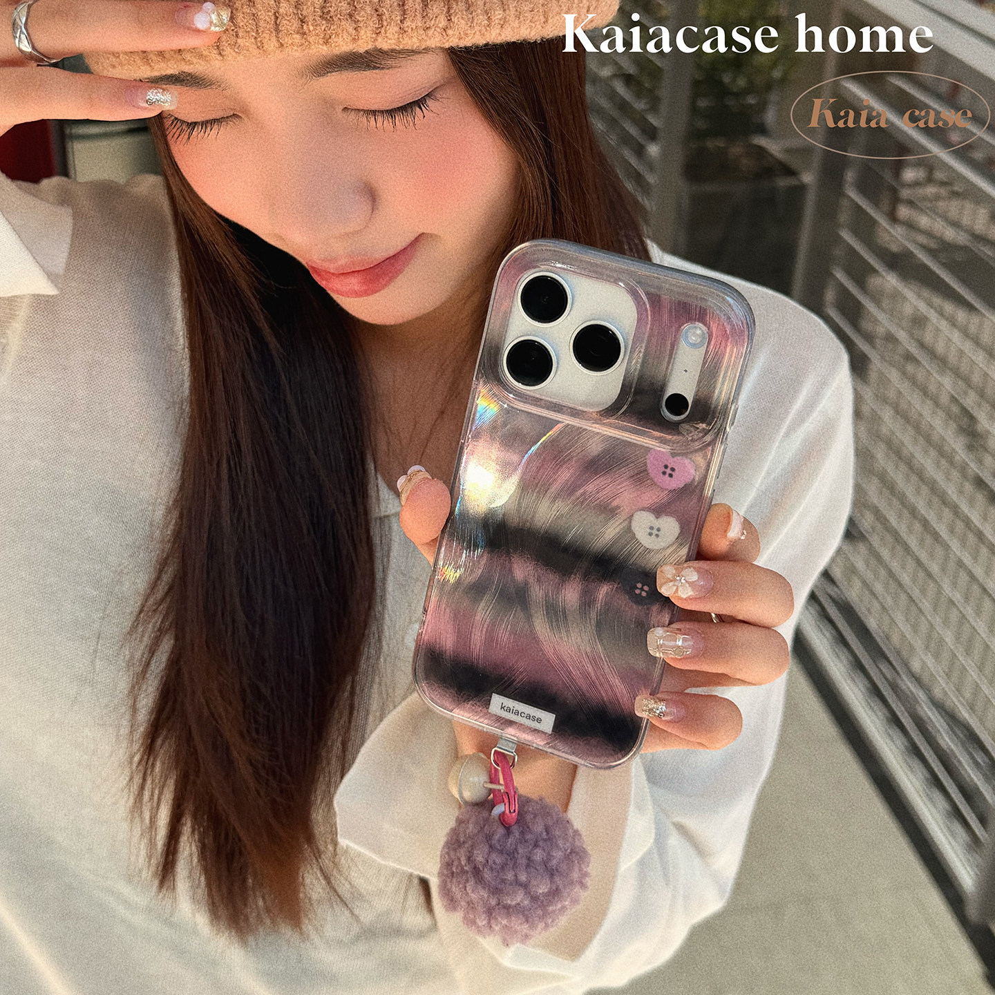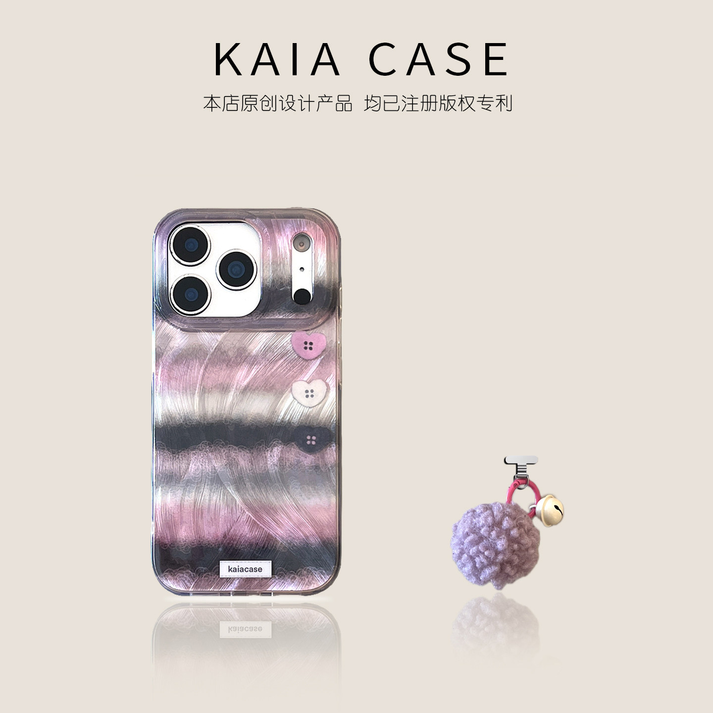 kaia 原创秋冬温柔紫皮草条纹适用苹果17promax手机壳iphone16pro新款13女14pro毛球挂件15pro镭射防摔手机套