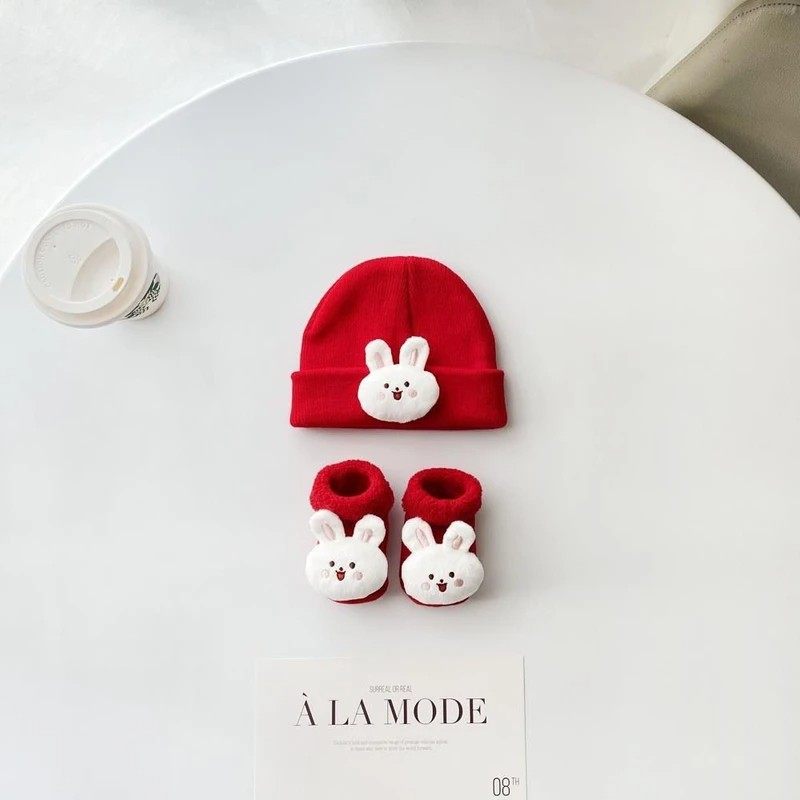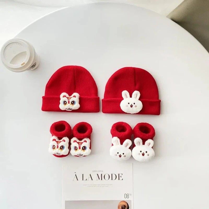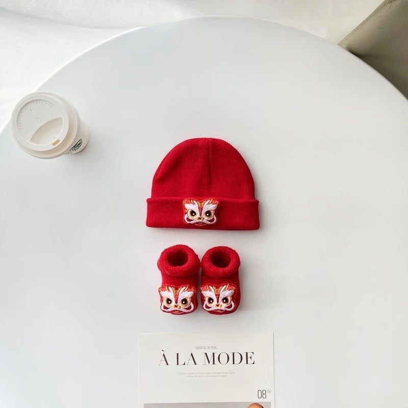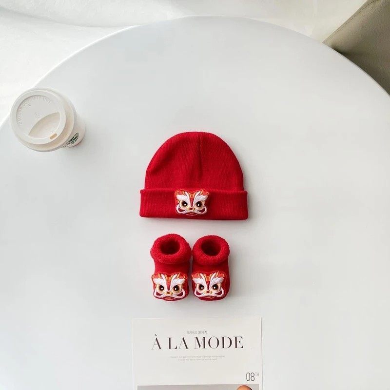 红色婴儿帽子秋冬婴幼儿针织帽厚袜子女童宝宝毛线帽满月百天醒狮