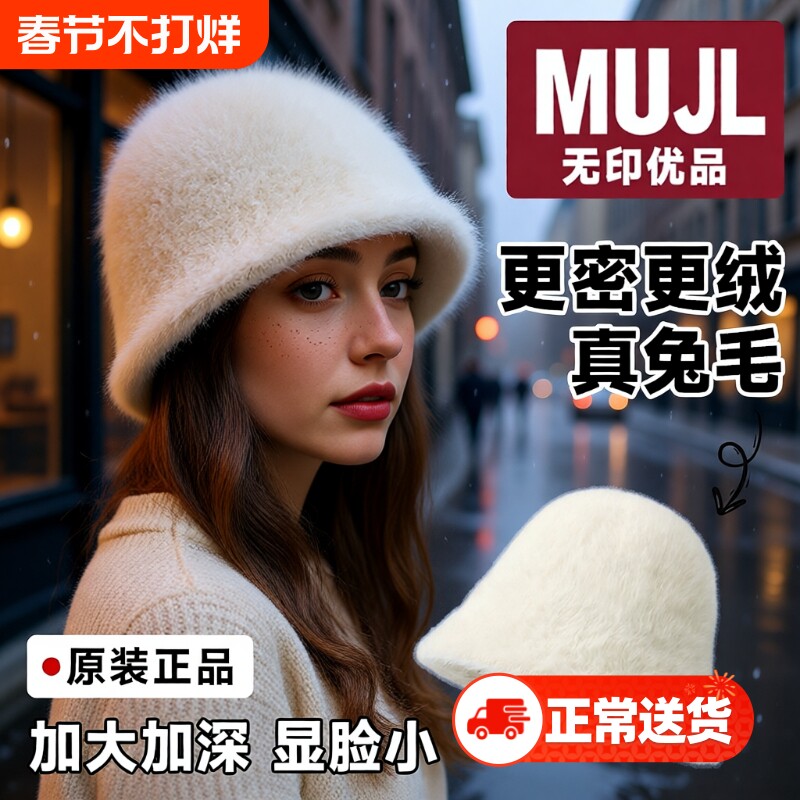 兔毛渔夫帽女2024新款秋天冬季毛绒白色帽子大头围显脸小保暖盆帽