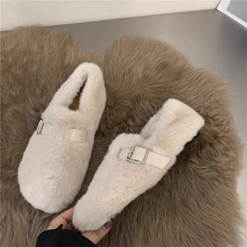 羊皮版复古玛丽珍鞋女方头秋冬季加绒保暖毛毛棉鞋平底晚晚单鞋女