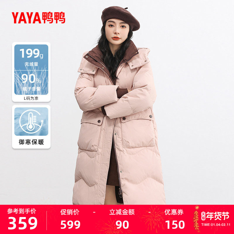 鸭鸭羽绒服女2025秋冬新款反季中长款连帽纯色韩版休闲加厚外套C