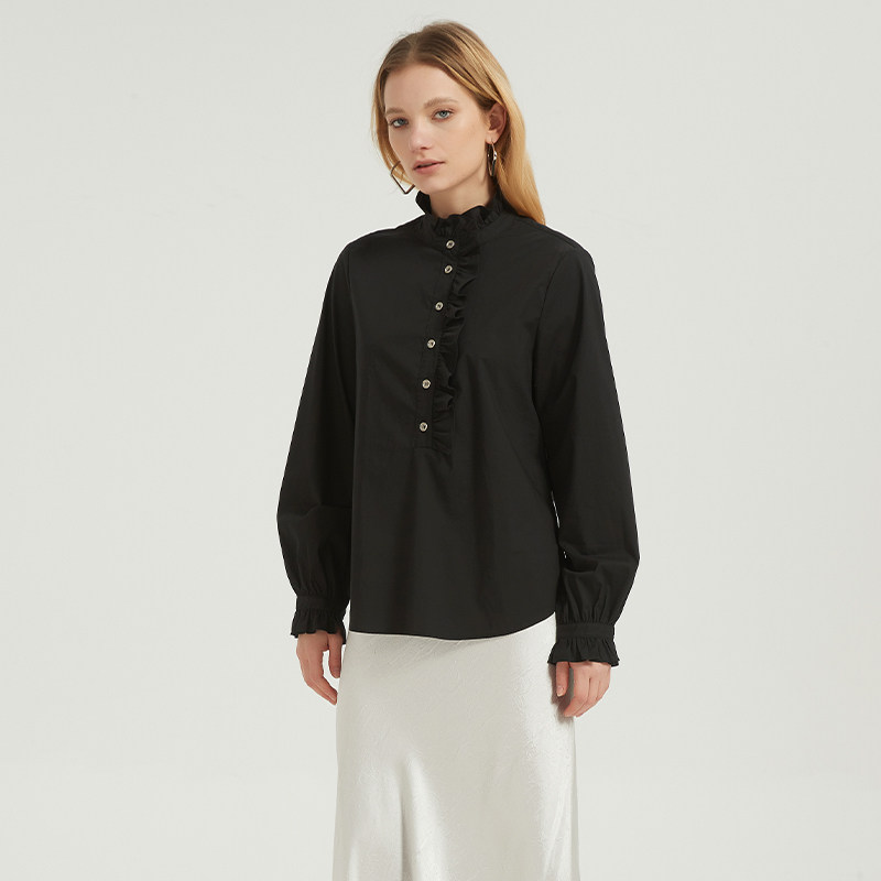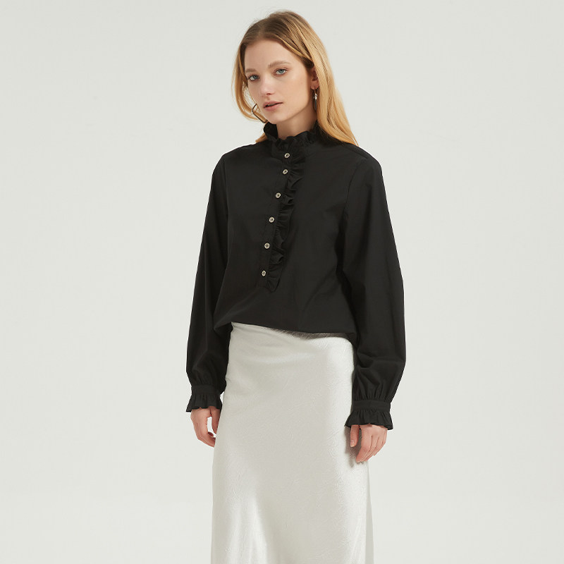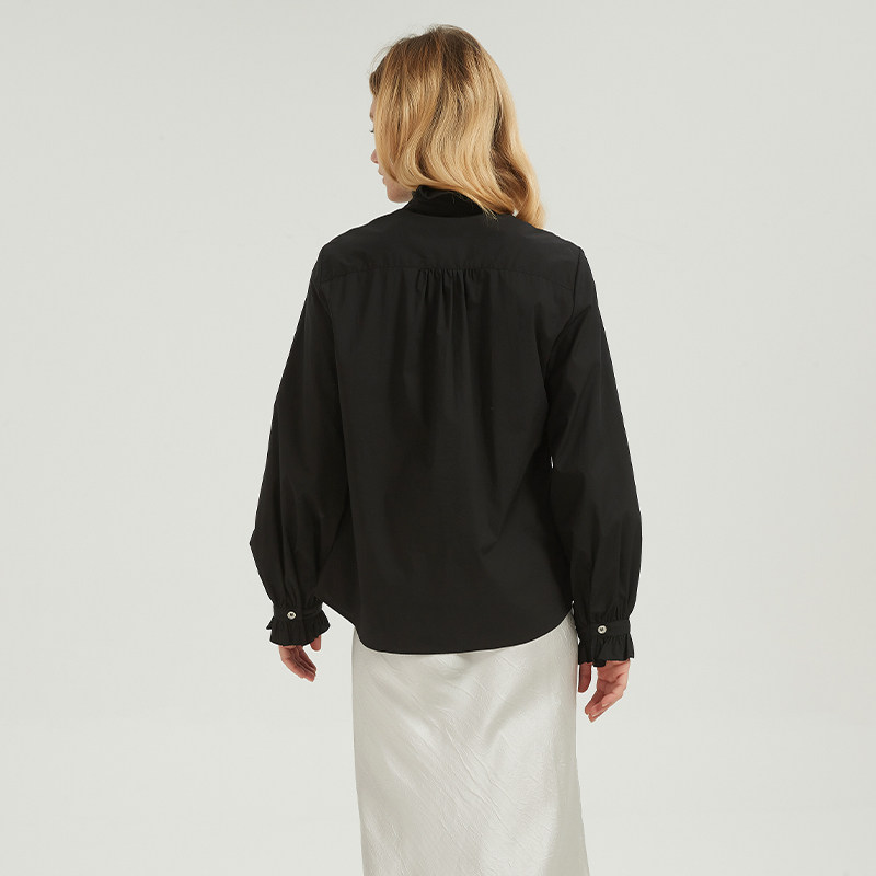 Petit Bari春夏不对称花边小高领长袖衬衫女棉质亲肤透气显瘦上衣