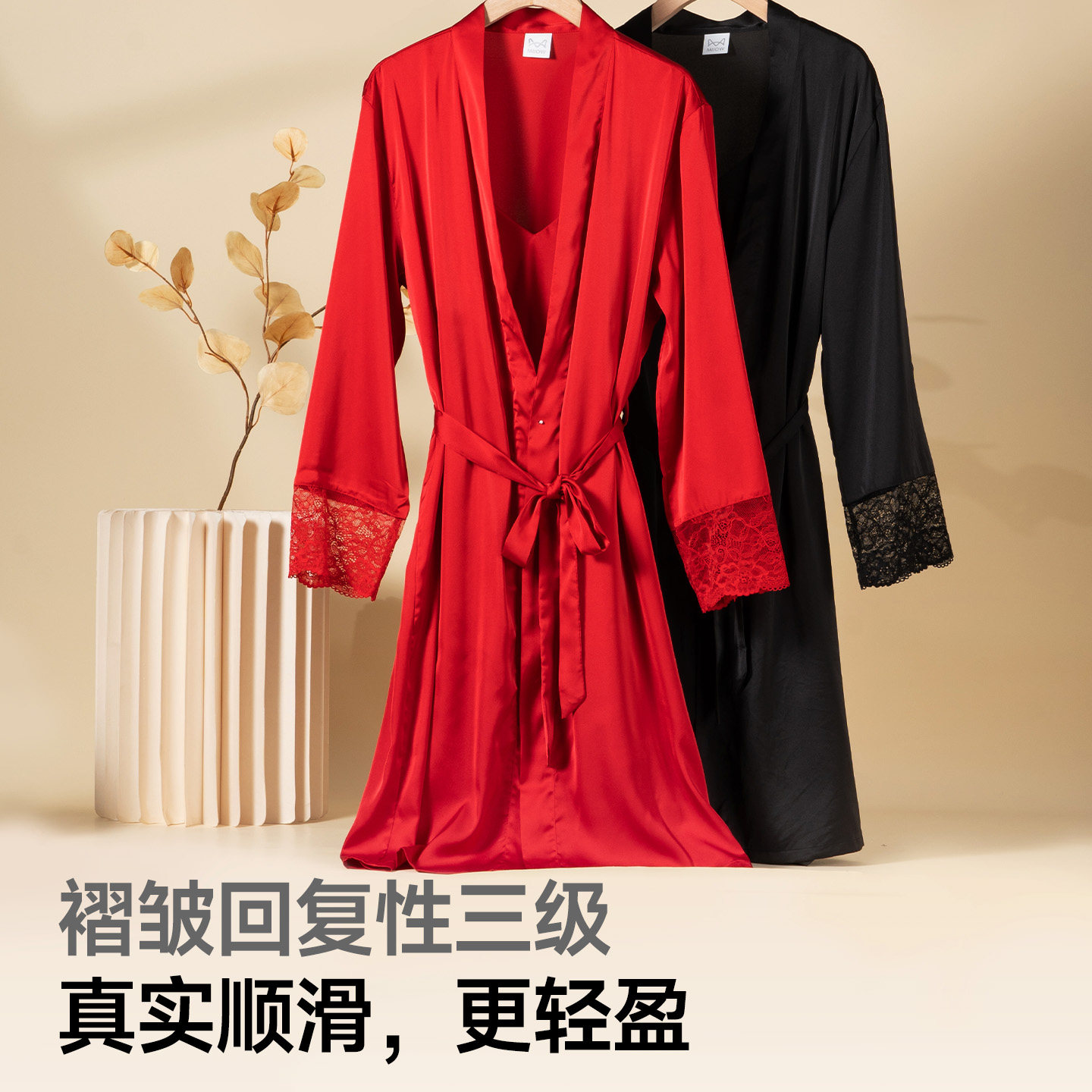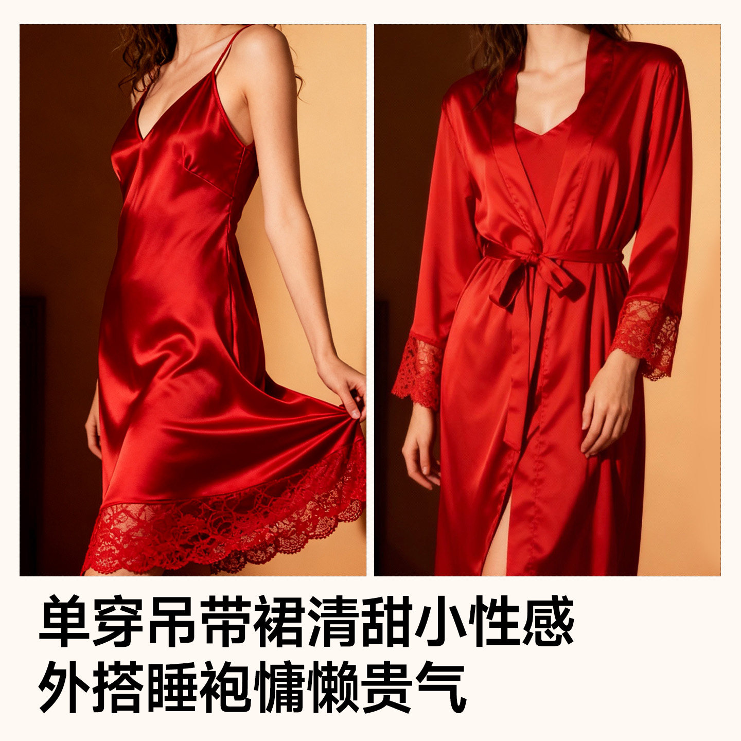 猫人2025新款吊带睡裙睡袍套装女春秋长款睡衣蕾丝拼接性感家居服