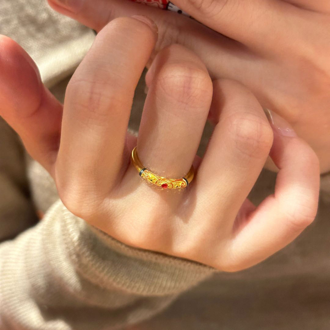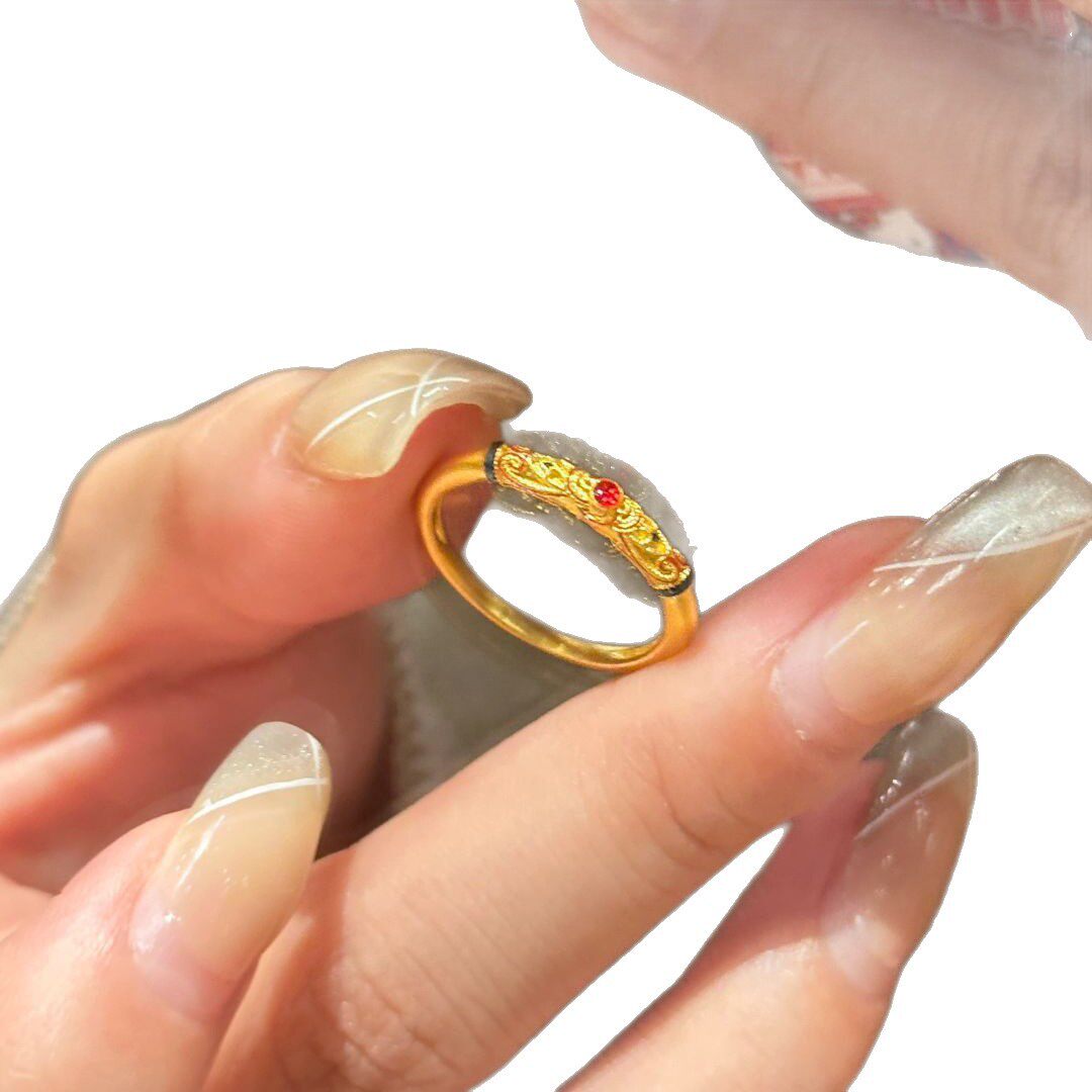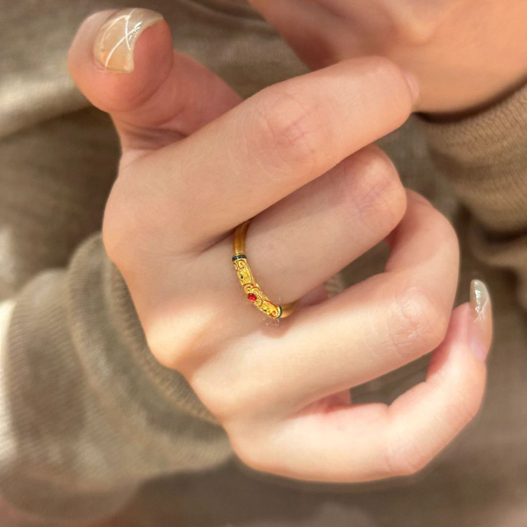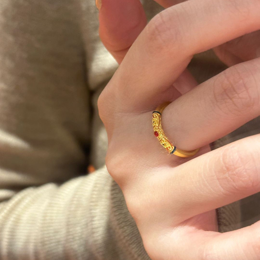 新中式古法精致复古金色珐琅花丝雕纹戒指女轻奢高级感可调节指环