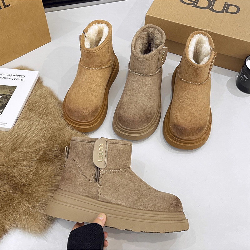 miu家厚底雪地靴女冬季真皮短靴羊毛侧拉链增高厚底加绒毛毛棉鞋
