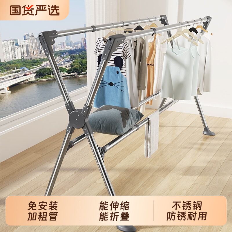 晾衣架落地阳台家用不锈钢伸缩折叠加厚晾衣杆晒衣架晒被子挂衣杆