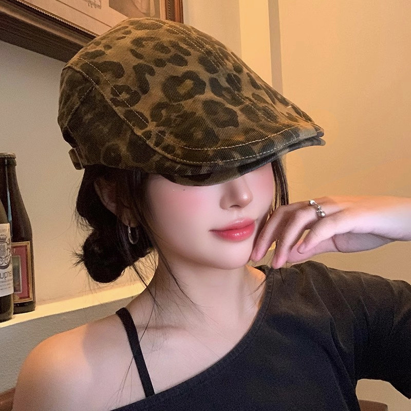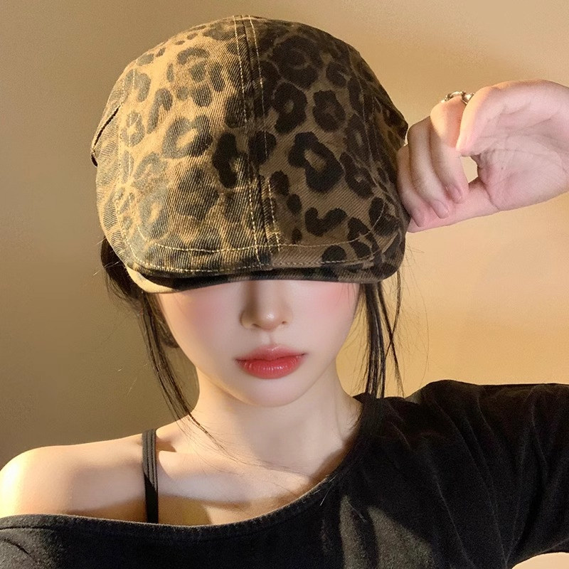 豹纹前进帽美式复古y2k辣妹贝雷帽女秋小众大头围百搭显脸小帽子