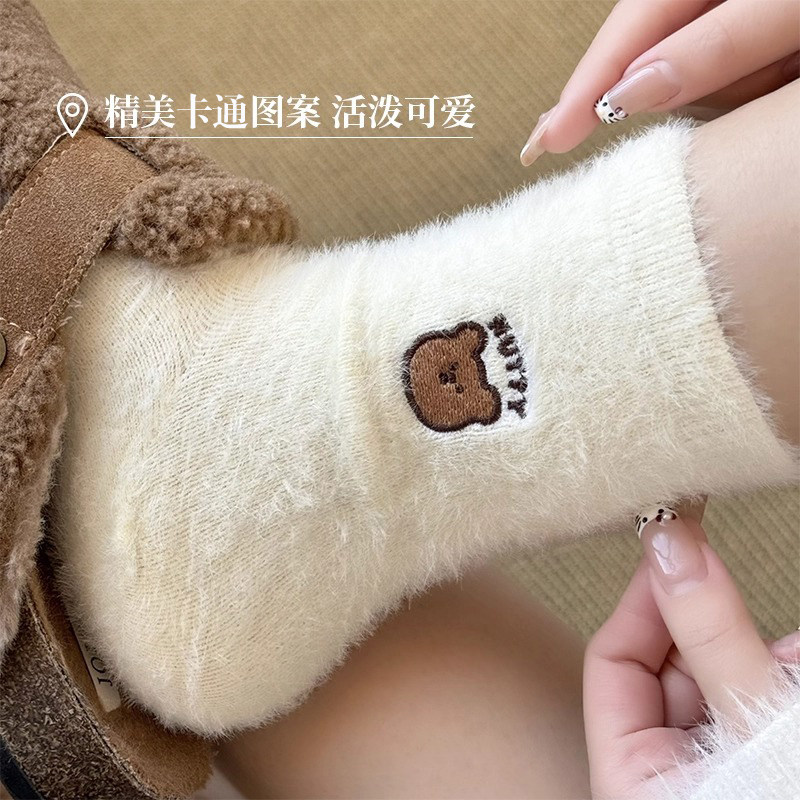 水貂绒袜子女秋冬季卡通毛绒保暖中筒袜加绒加厚冬天居家地板长袜