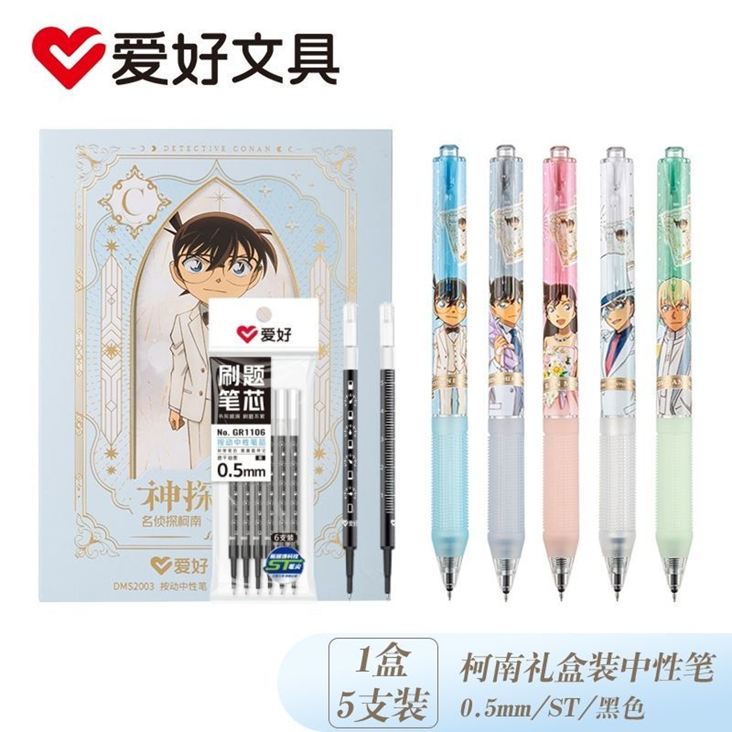 爱好名侦探柯南联名按动中性笔礼盒0.5黑色中性笔ST尖速干顺滑小学生学习用品初中生礼物文具大礼包开学礼盒