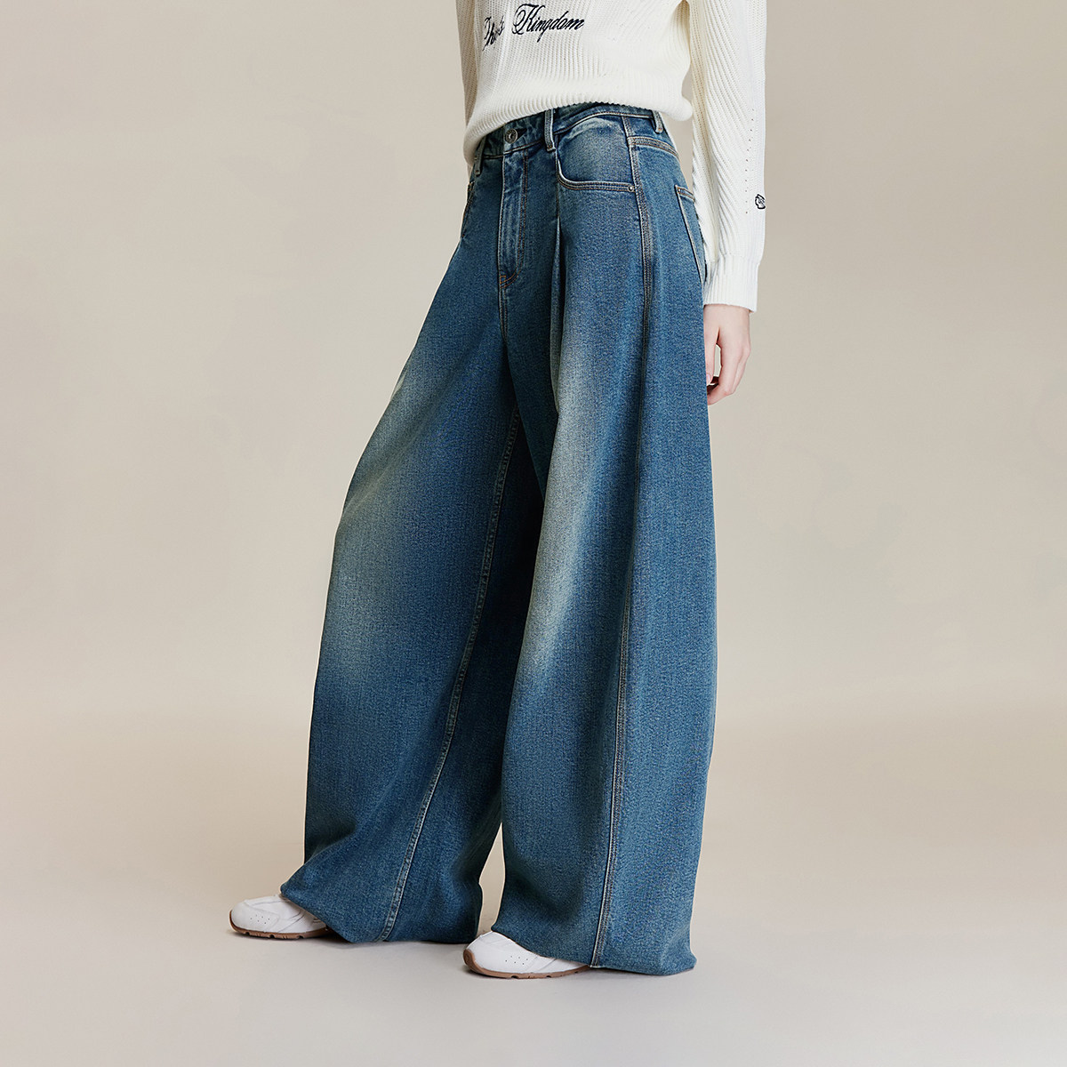 森马牛仔裤女冬抓毛莱赛尔阔腿裤2025新款白色拖地裤蓝色流行高腰