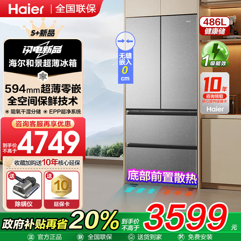 换新补贴超薄海尔冰箱法式486L升零嵌入式多门一级能效家用旗舰店