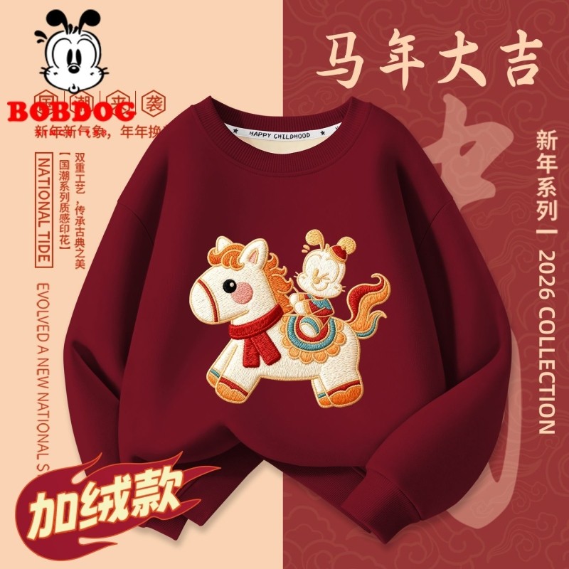 巴布豆儿童加绒卫衣2026男童马年红色上衣女童本命年拜年服冬新年