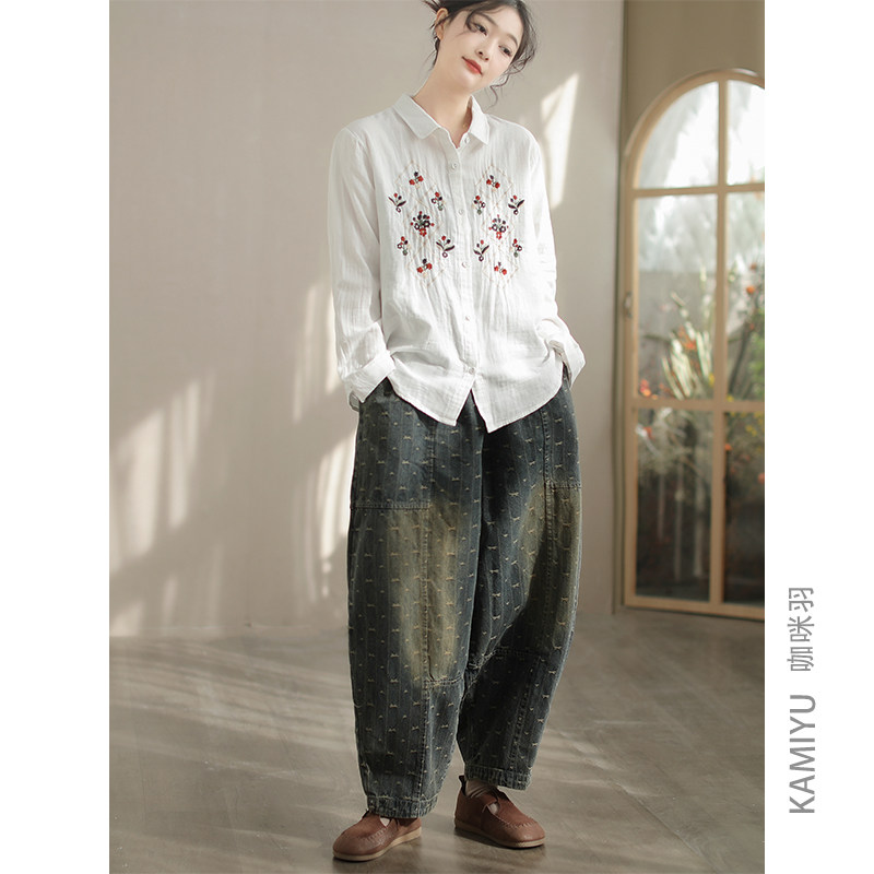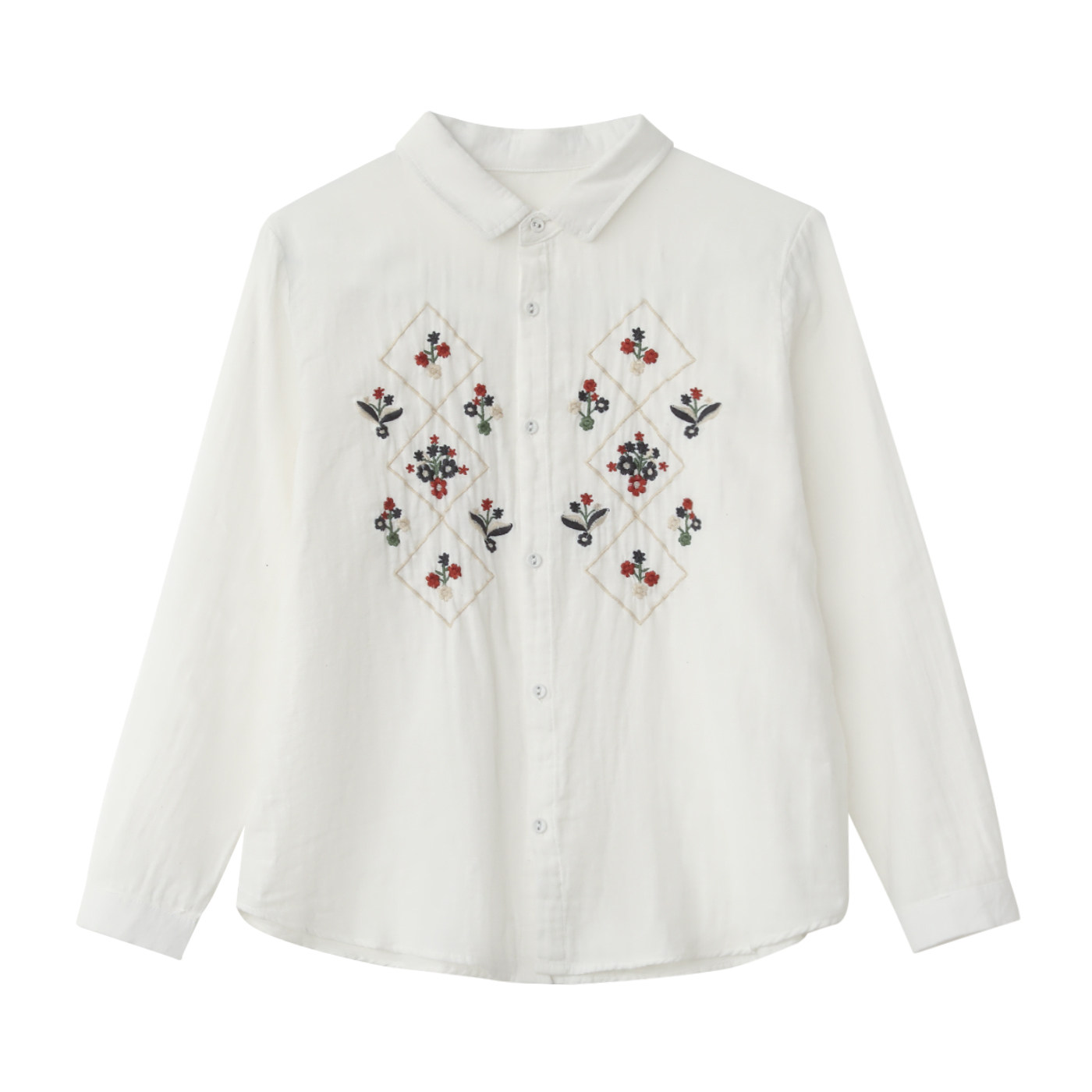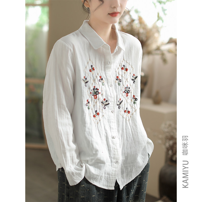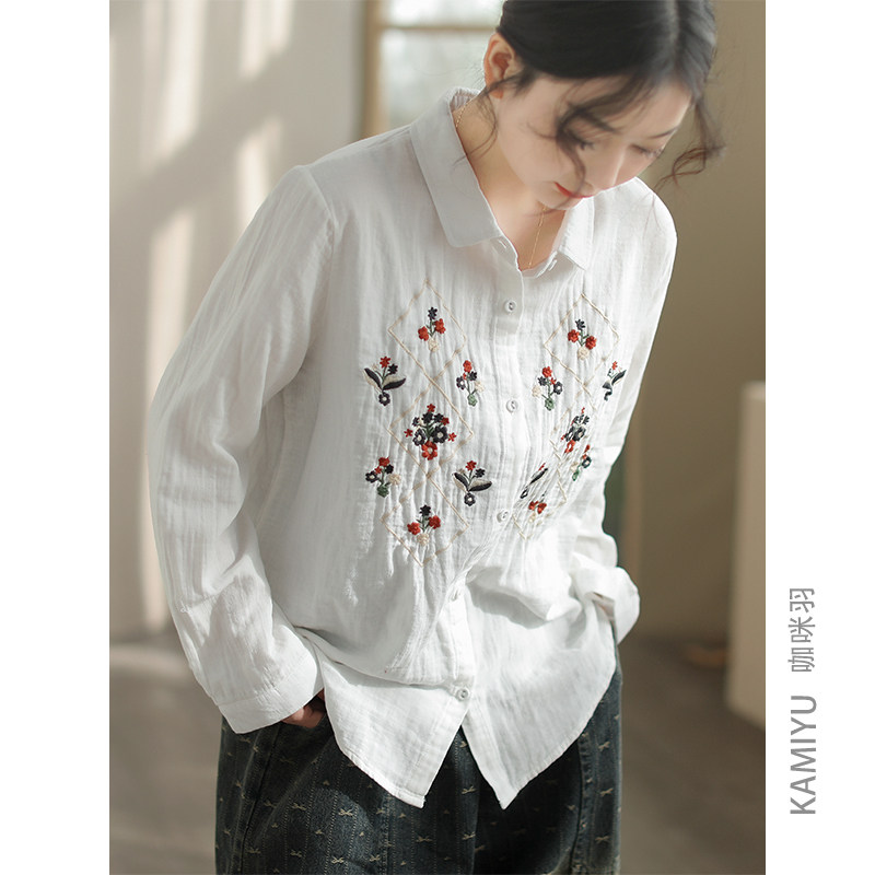咖咪羽衬衫女春秋新款原创休闲刺绣女式上衣白色简约百搭女装开衫