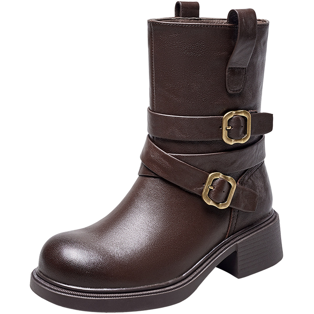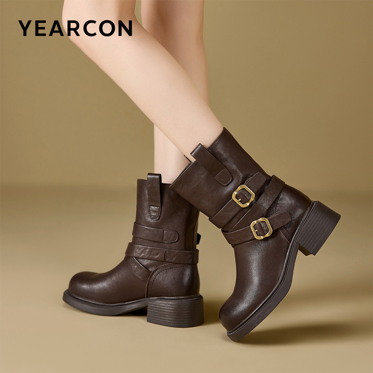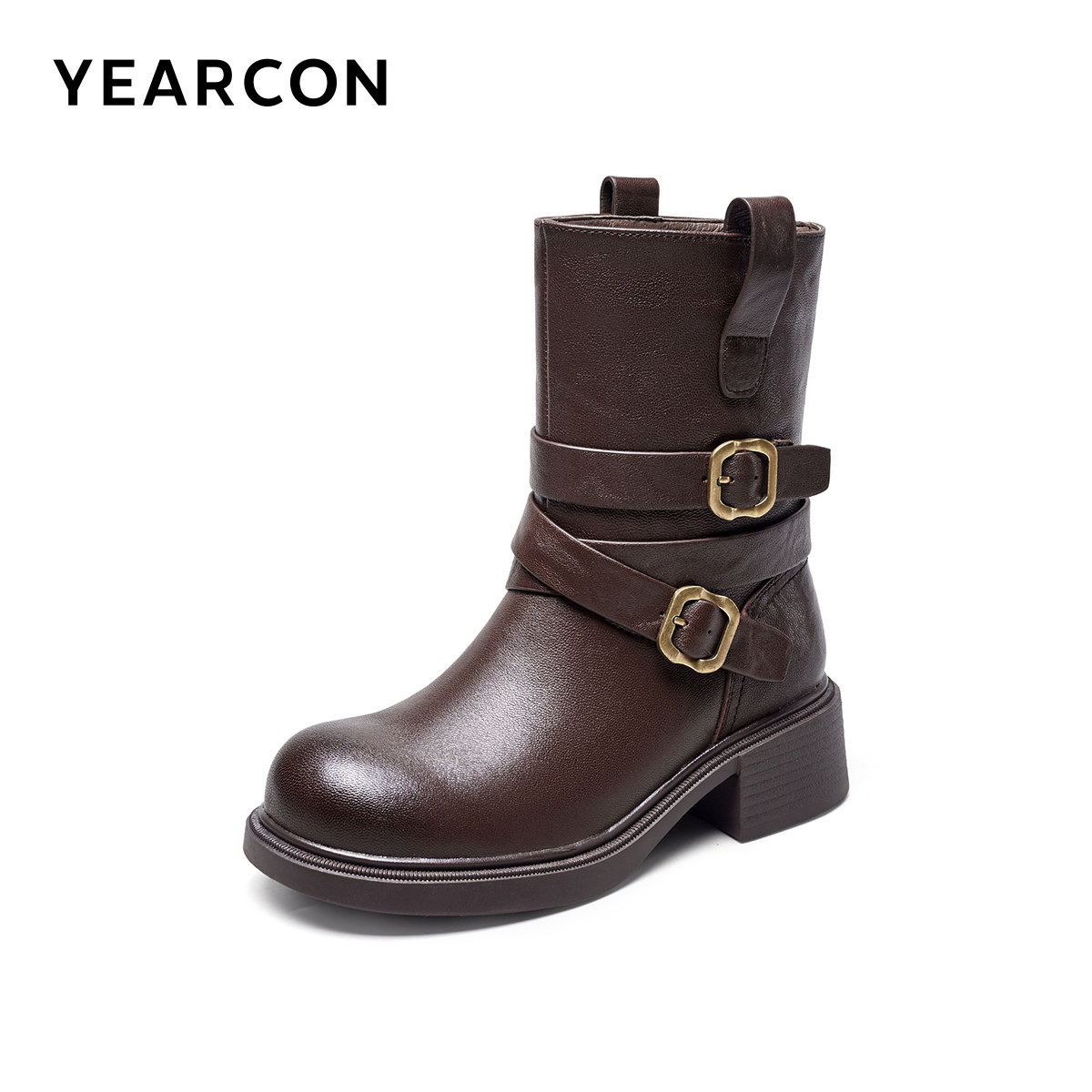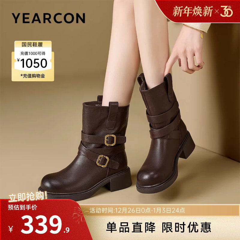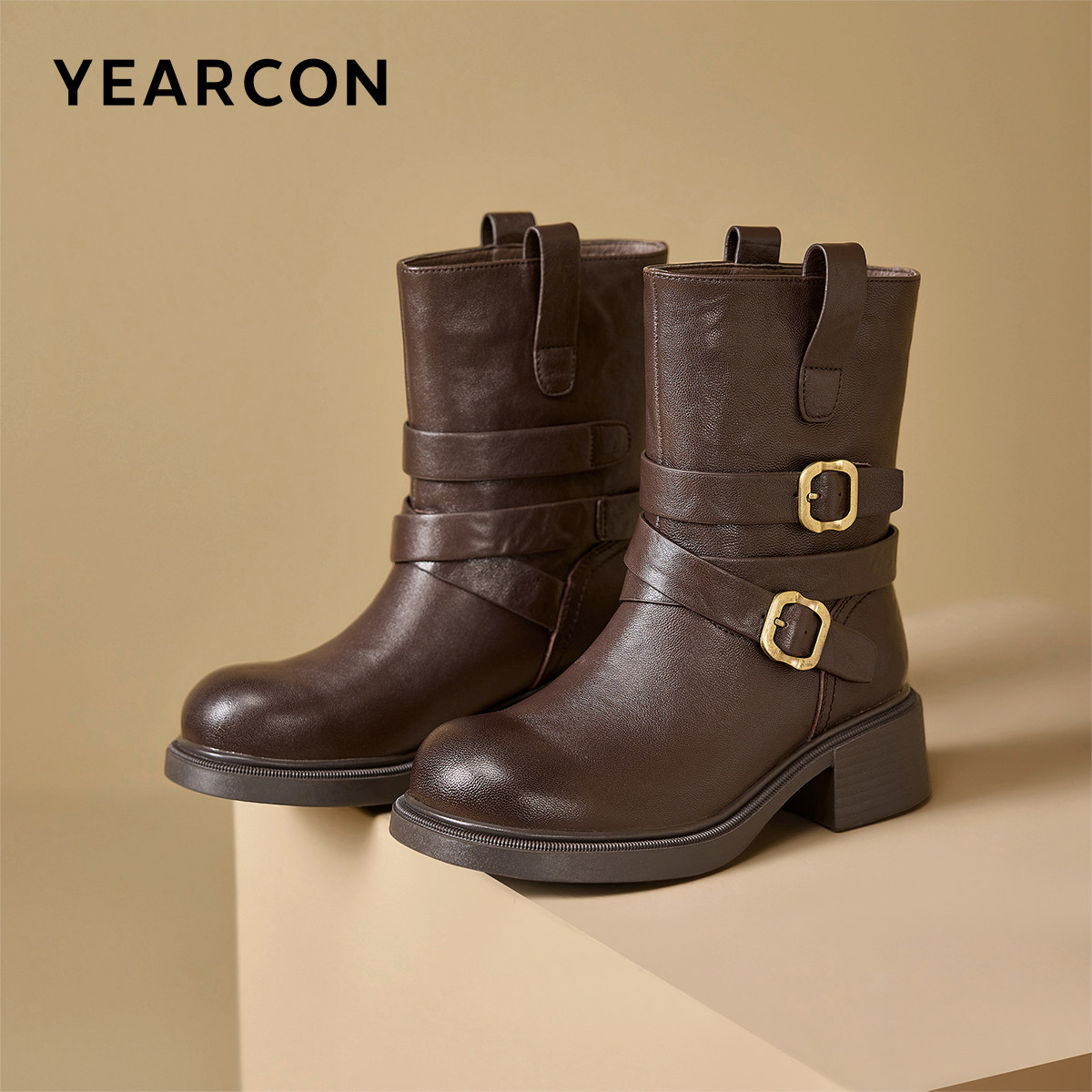意尔康女鞋2025冬季皮靴加绒中筒气质机车靴复古女士皮带扣骑士靴