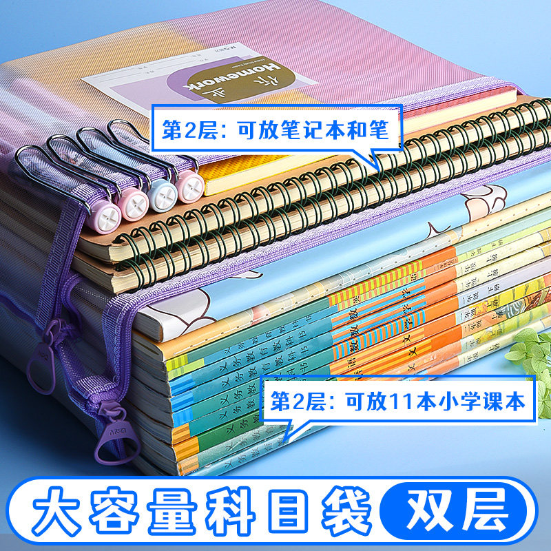 晨光文具学科科目分类袋小学生文件袋拉链式试卷收纳袋透明网纱双层大容量书袋作业资料a4考试专用袋票据产检