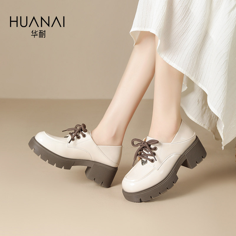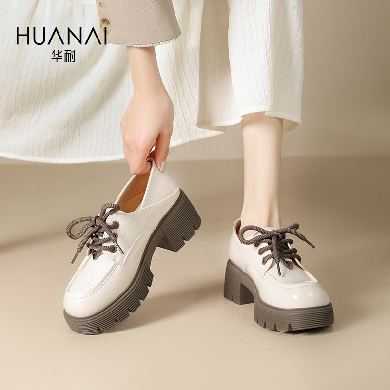 华耐米白色粗跟小皮鞋系带学院风2025秋季新款增高jk制服乐福鞋