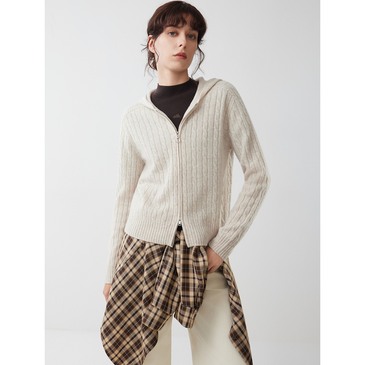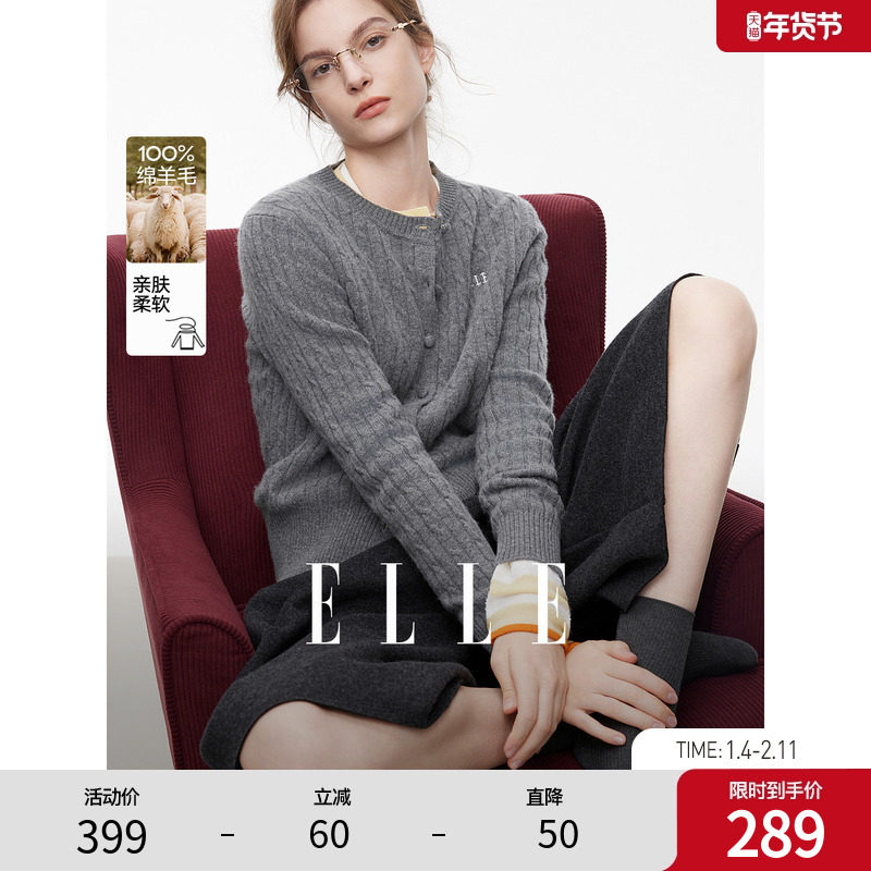 【100%绵羊毛】ELLE灰色格雷系绞花针织开衫女2025冬新款休闲毛衣