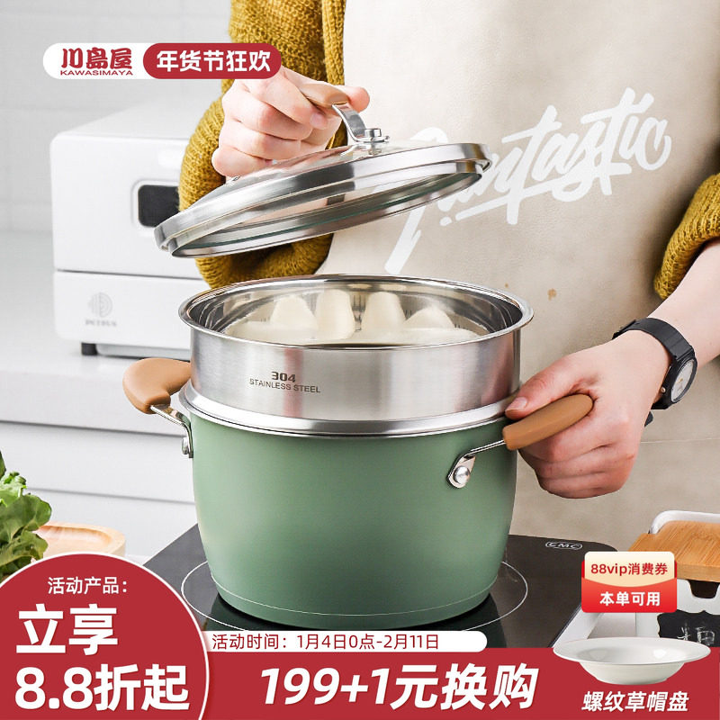 川岛屋蒸锅家用2025新款不锈钢电磁炉燃气灶专用汤锅带蒸笼煮炖锅