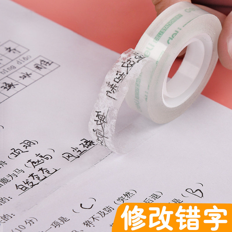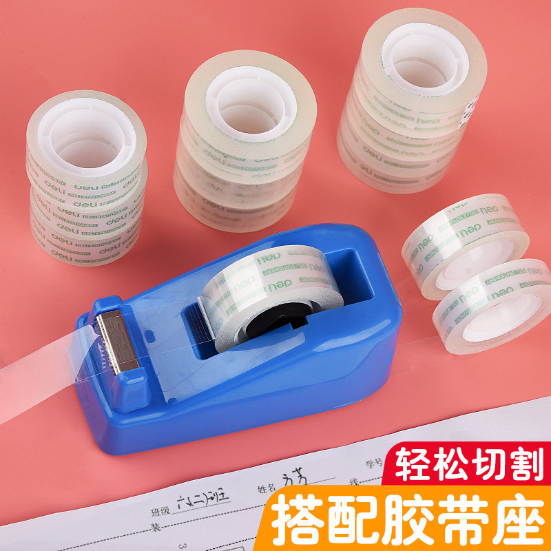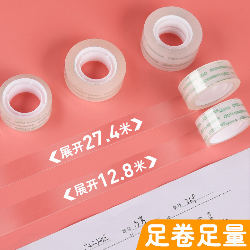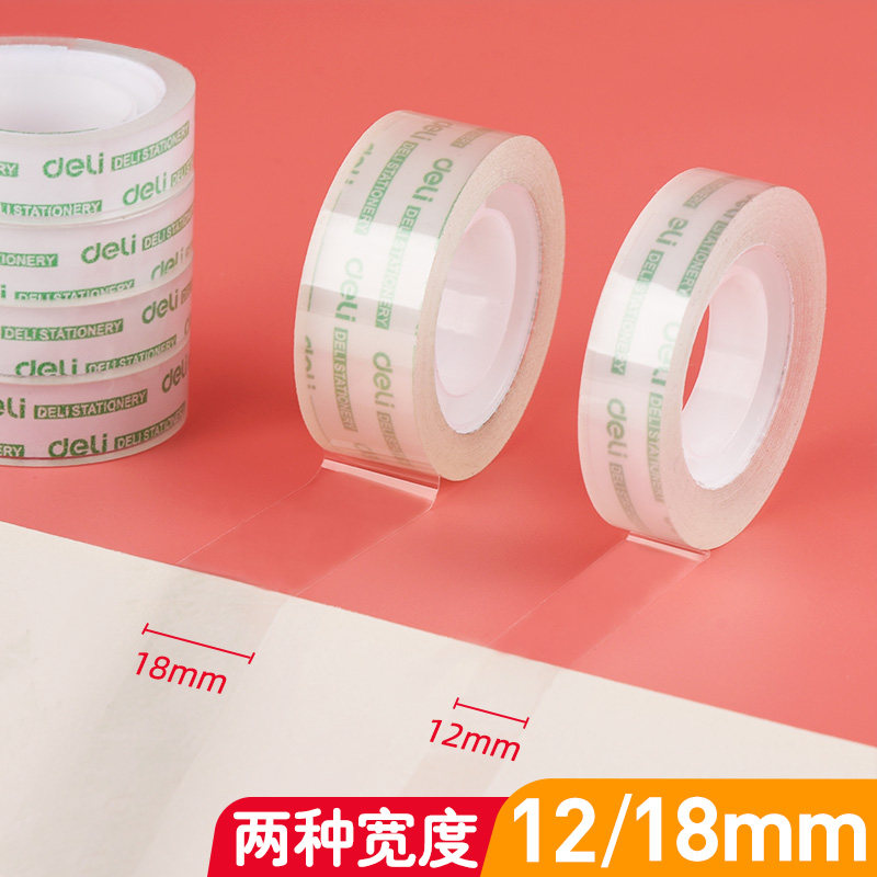 得力高透明胶带小号学生用粘错题无痕不留胶宽胶纸12/18mm整卷批发办公封口工具小巧便携胶带座配套轻松切割