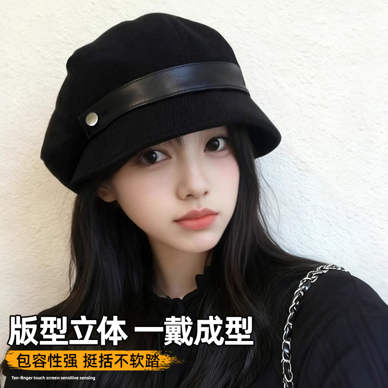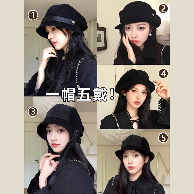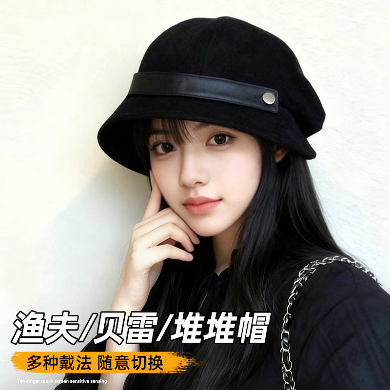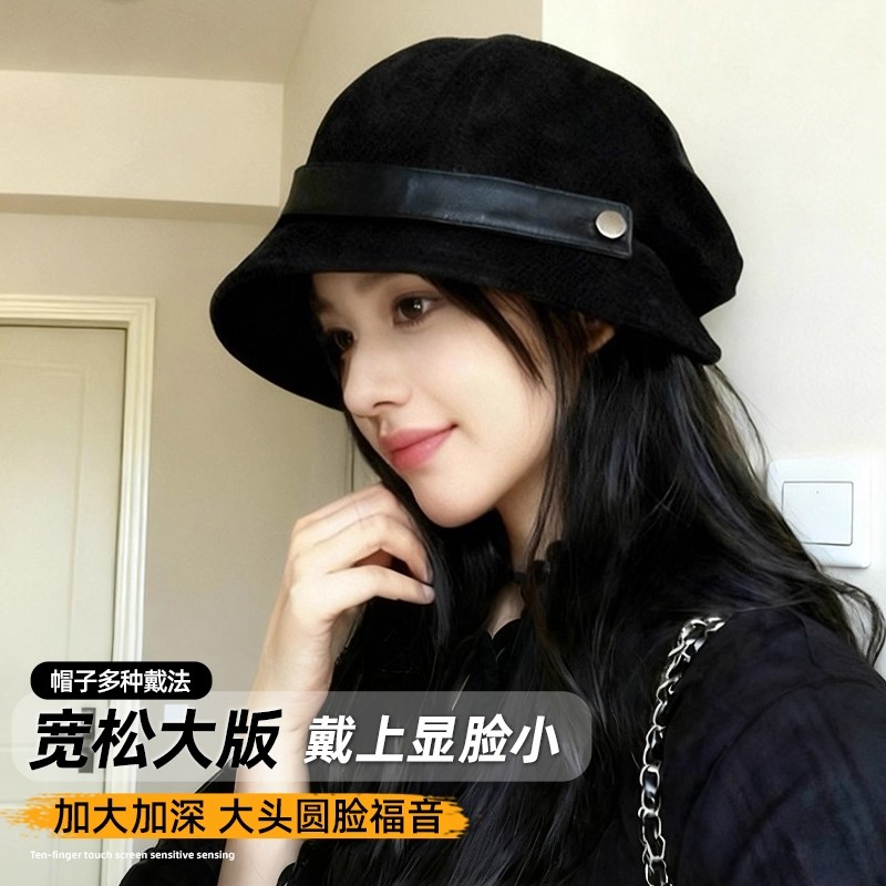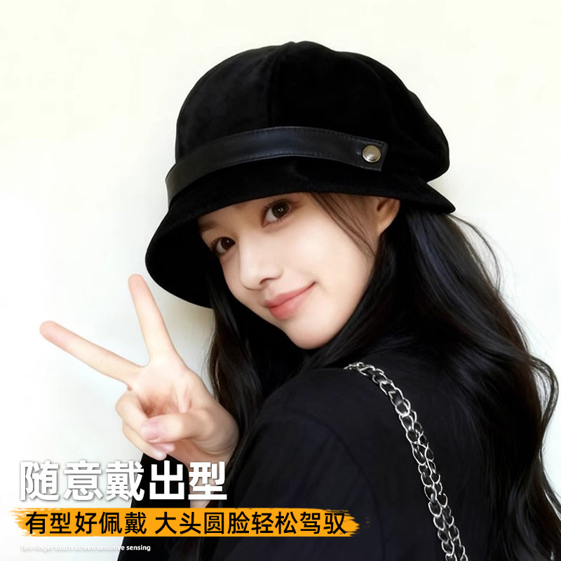 2025新款百搭帽子女秋冬灯芯绒渔夫帽黑色盆帽大头围显脸小贝雷帽