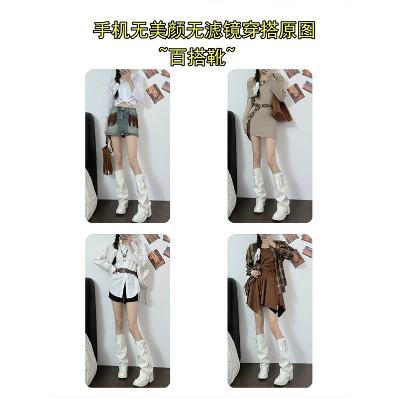 潼潼TONG毒液靴皮带扣高筒骑士靴2025新款真皮复古粗跟厚底机车靴