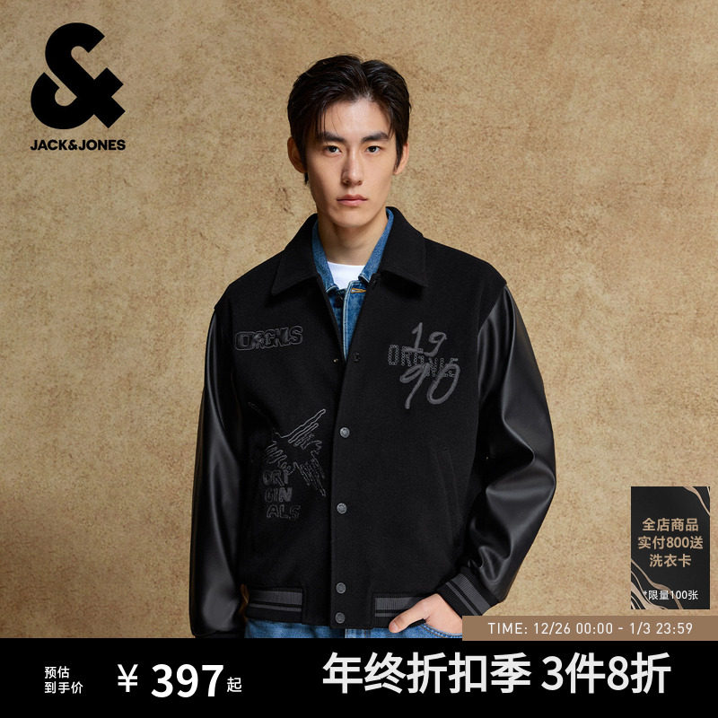 杰克琼斯夹克男秋季新款仿毛呢PU拼接外套宽松休闲棒球服上衣男装