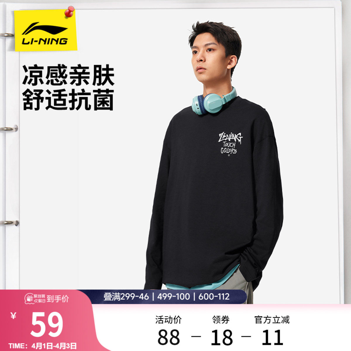 李宁长袖T恤男士官方新款春季情侣款圆领休闲上衣女士针织运动服